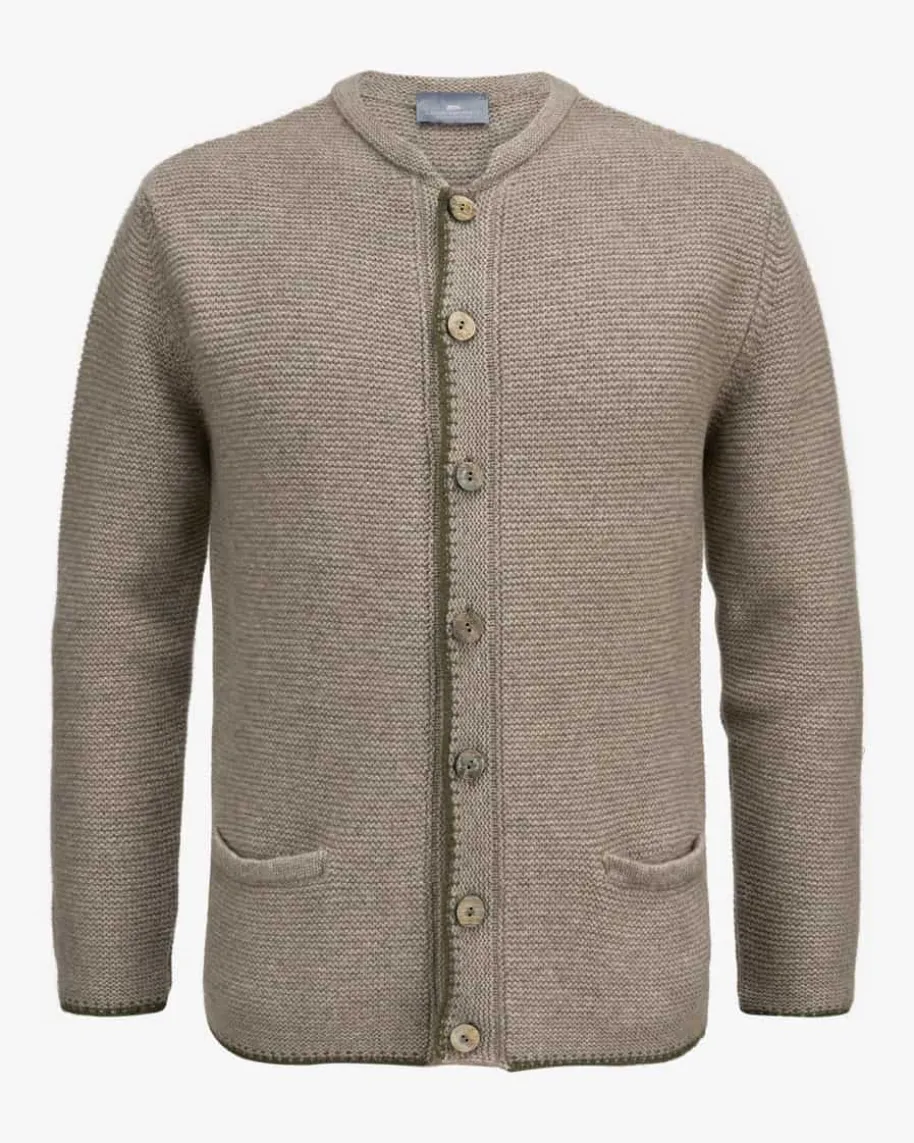 Alex Trachten-Cashmere-Strickjacke für Herren von LODENFREY in Beige und Oliv.Das exklusive Modell aus besonders weicher Cashmere-Qualität besticht dankklassischem Strick-Dessin in traditioneller Aufmachung, während diePaspelierungen sowie Holz-Knöpfe den Trachten-Look harmonisch vollenden.