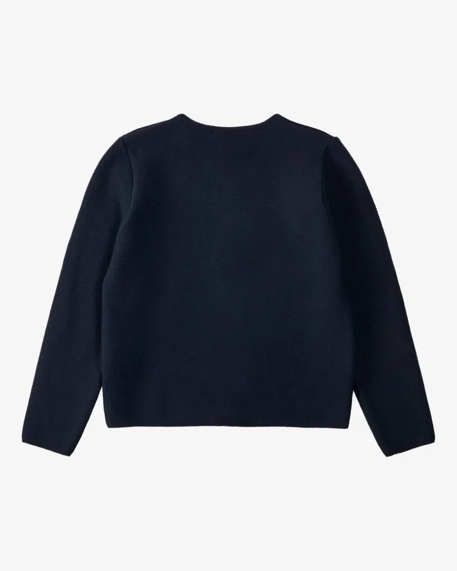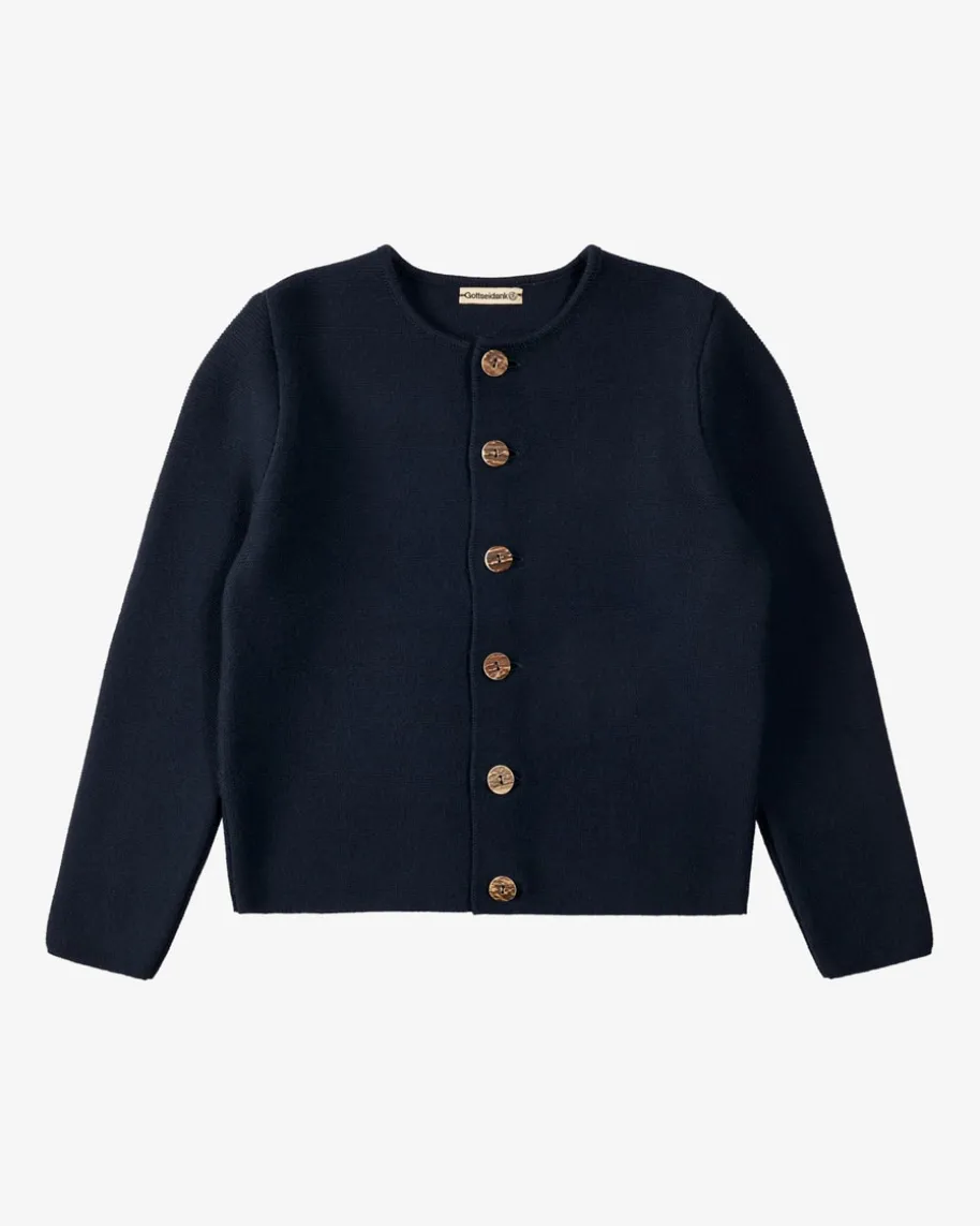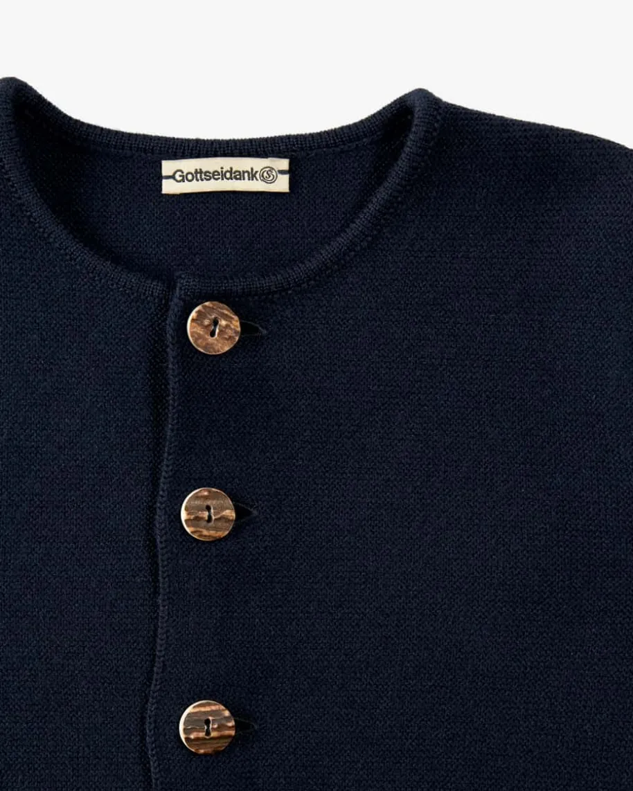 Alex Trachten-Strickjacke für Jungen von Gottseidank in Navy. Traditionell unddetailverliebt – Das Modell begeistert dank der stilvollen Hornknöpfe sowie derVerwendung von extrafeiner Merinowolle als weicher Begleiter für moderneTrachten-Looks.