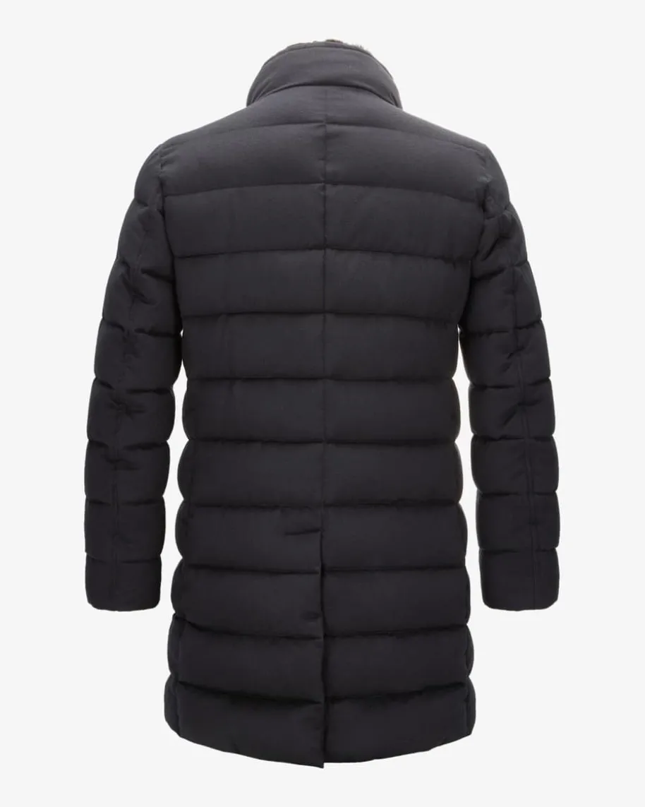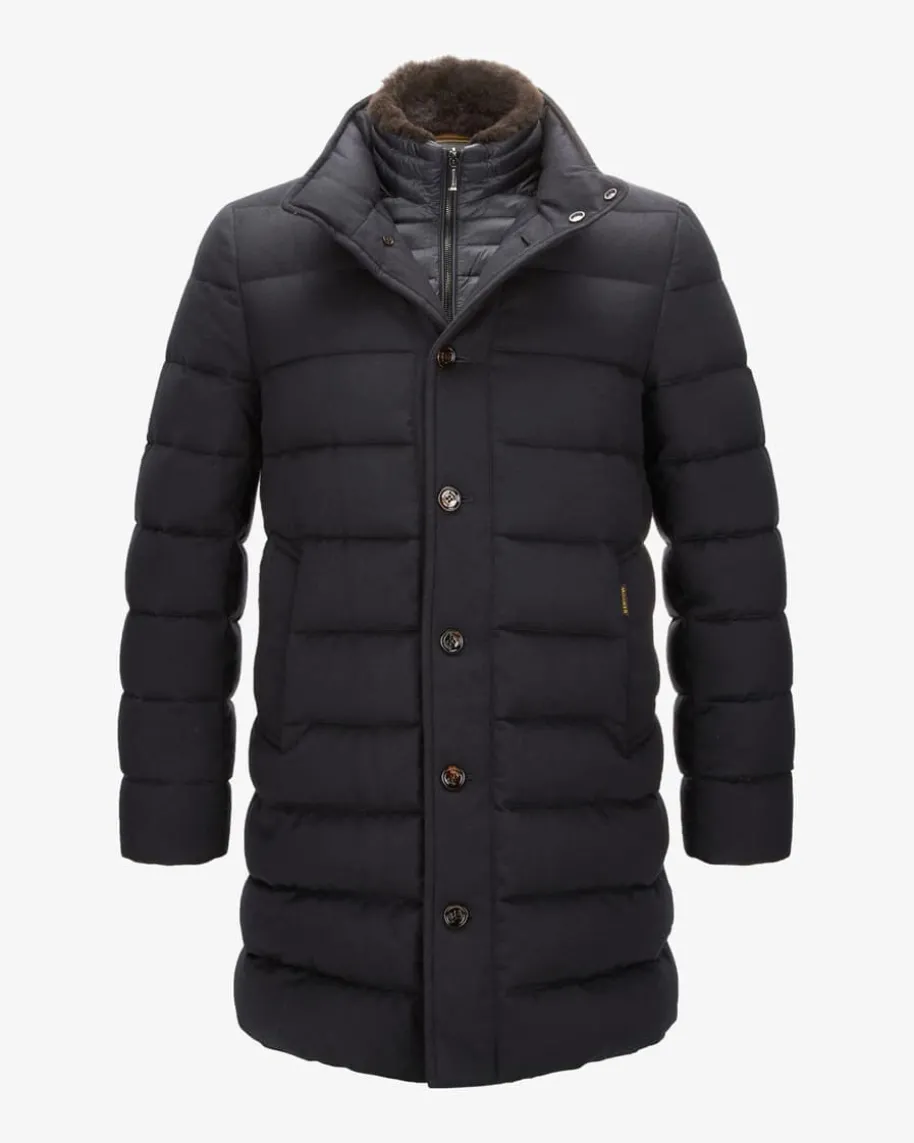 Alfieri Cashmere-Mantel für Herren von Moorer in Navy. Made in Italy – Das imNordenItaliens ansässige Label steht für hochwertige Jacken, gefertigt aus feinstenMaterialien und jedes Design steht für den klassischen Mode-Charme Italiens.Auch dieses Modell vereint maskulinen Charme mit funktionalen Eigenschaften.Während die hochwertige Cashmere-Qualität für ein edles Finish sorgt, bietet diewärmeisolierende Daunen-Feder-Füllung optimalen Schutz vor Kälte.