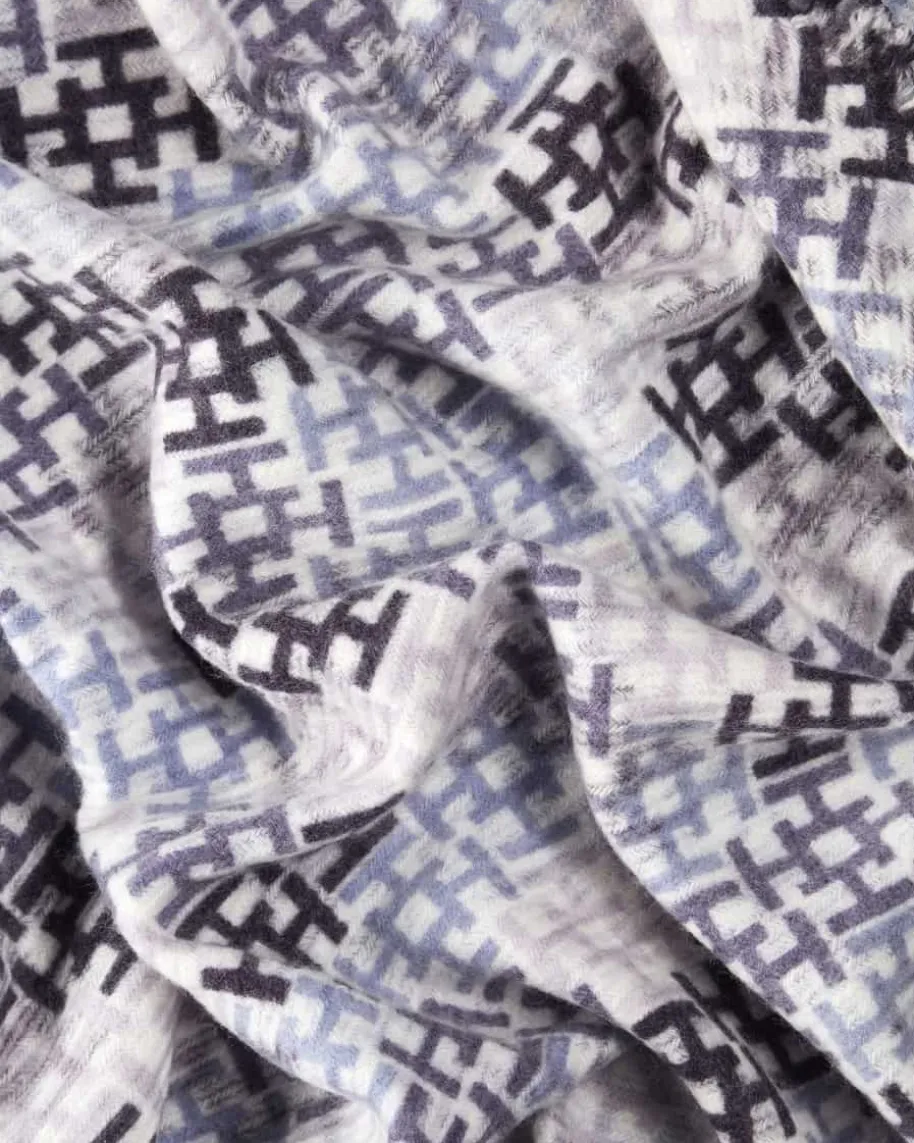 Aliki-Tri Cashmere-Tuch für Damen von Hemisphere in Blau, Flieder und Weiß. Derdreieckige Schal aus hochwertiger Cashmere-Wolle punktet mit einem weichenGriff, während das Monogramm-Muster ein stilvolles Accessoire kreiert, welcheszugleich als Cape getragen werden kann.