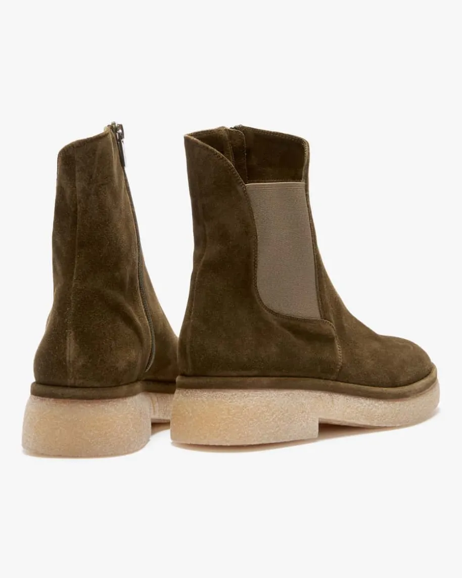 Alison R Beat Chelsea Boots für Damen von AGL in Dunkeloliv. Das Modellüberzeugt dank hochwertiger Velourleder-Qualität in stilvoller Aufmachung,während elastische Einsätze moderne Akzente setzen. Zugleich rundet die markanteSohle das Gesamtbild harmonisch ab.