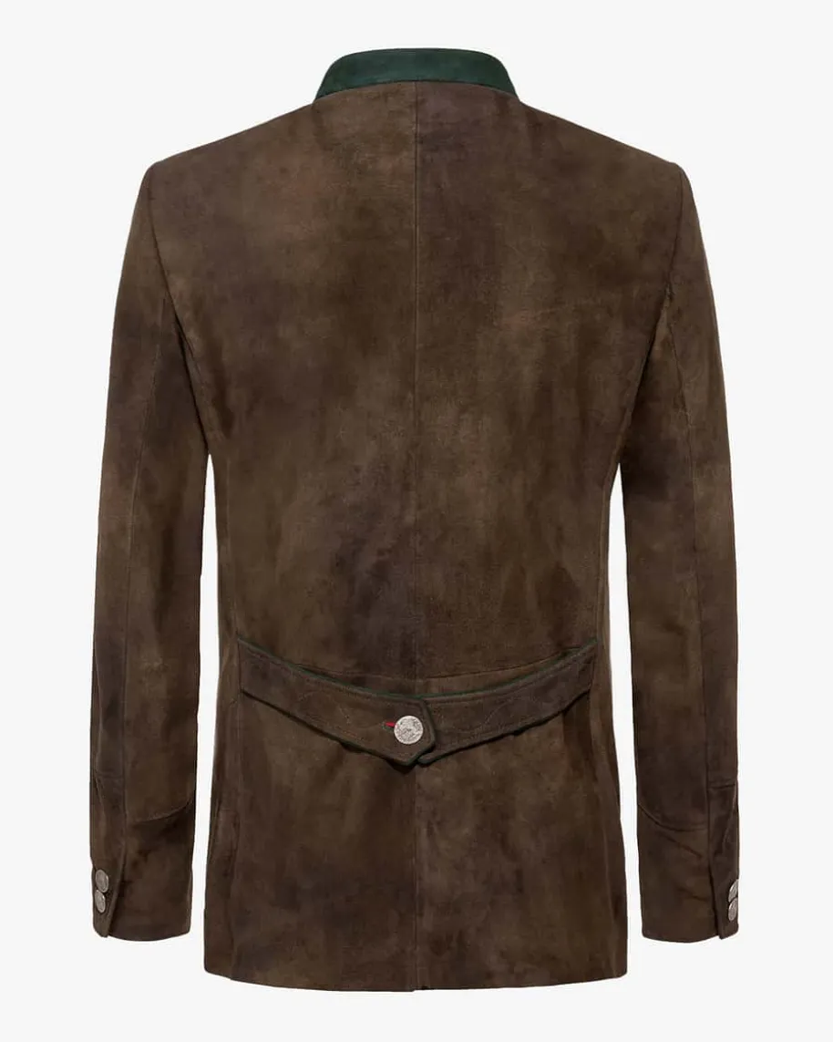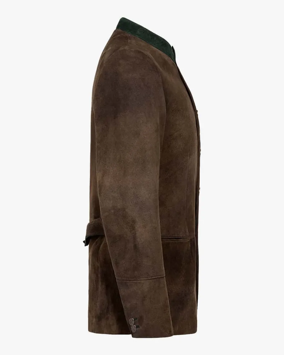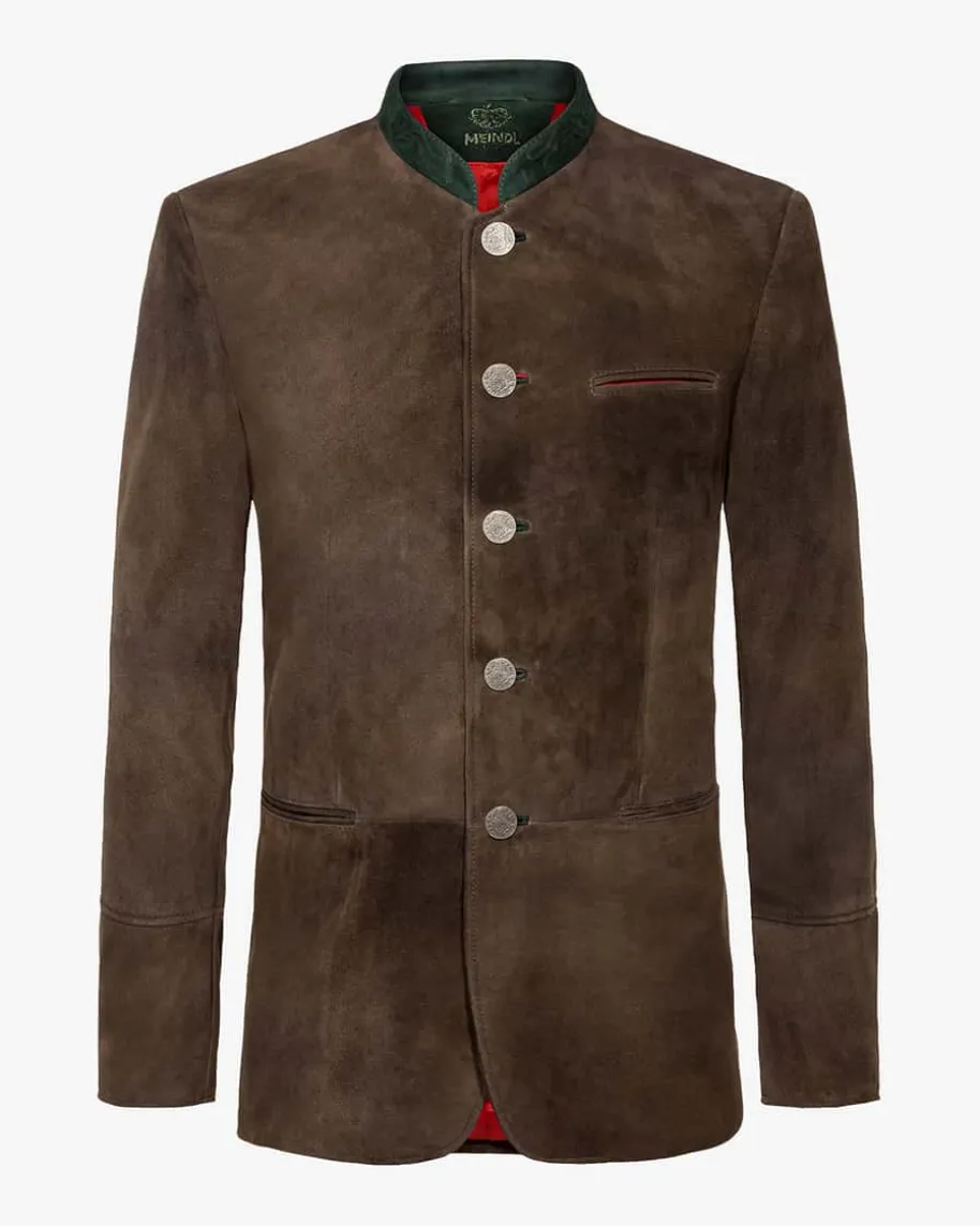 Amadeus Lederjanker für Herren von Meindl in Walnuss. Edles Nappaleder in stilvoller Farbgebung verleiht dem Janker mit klassischer Passform eine moderne und zugleich rustikale Aufmachung, die von den Knöpfen mit Münz-Prägung perfekt in Szene gesetzt wird. Farblich abgesetzte Kontraste an Stehkragen, Kanten und Zierriegel als auch geknöpfte Ärmelenden vollenden das Modell mit drei Außen- und zwei Innentaschen.