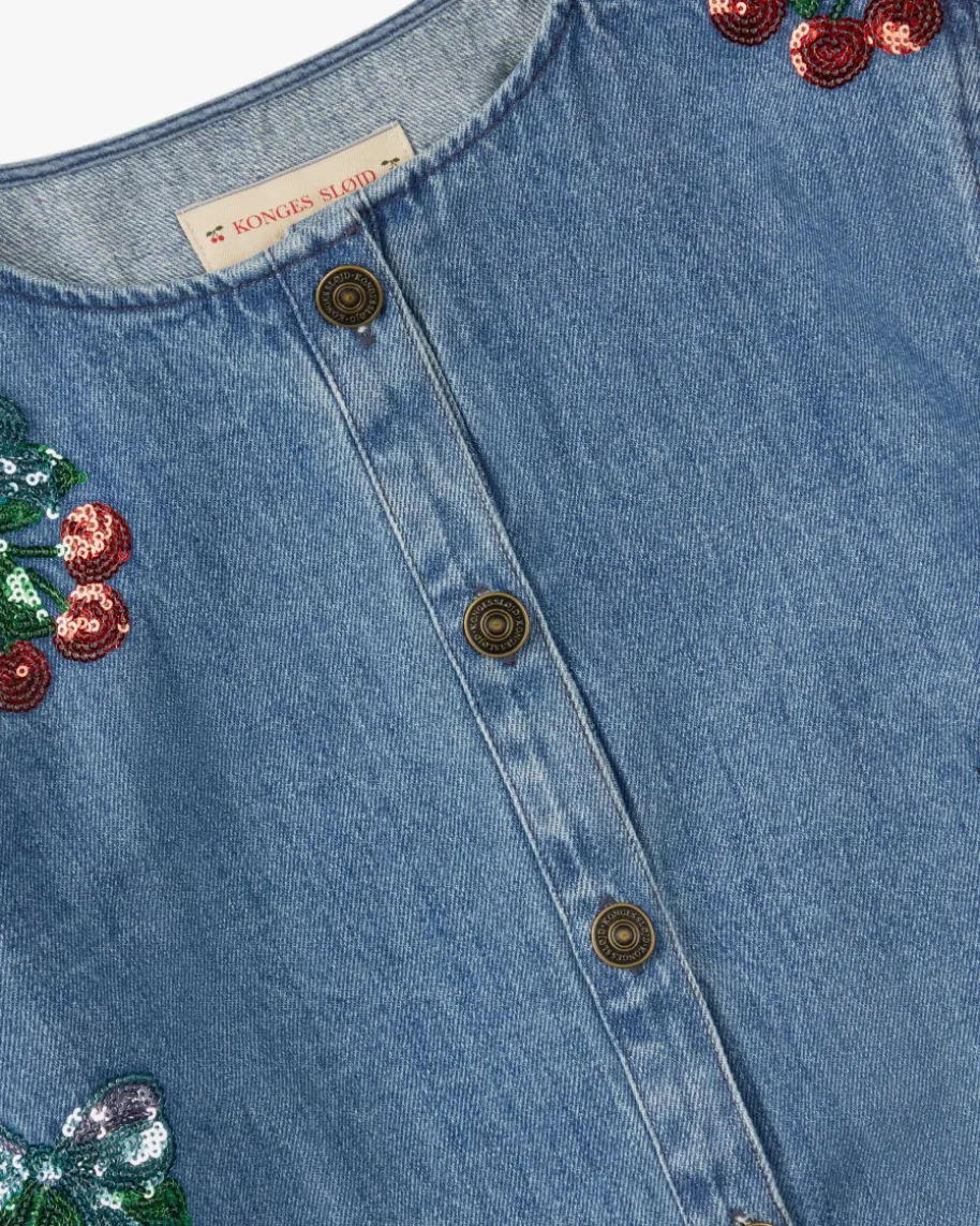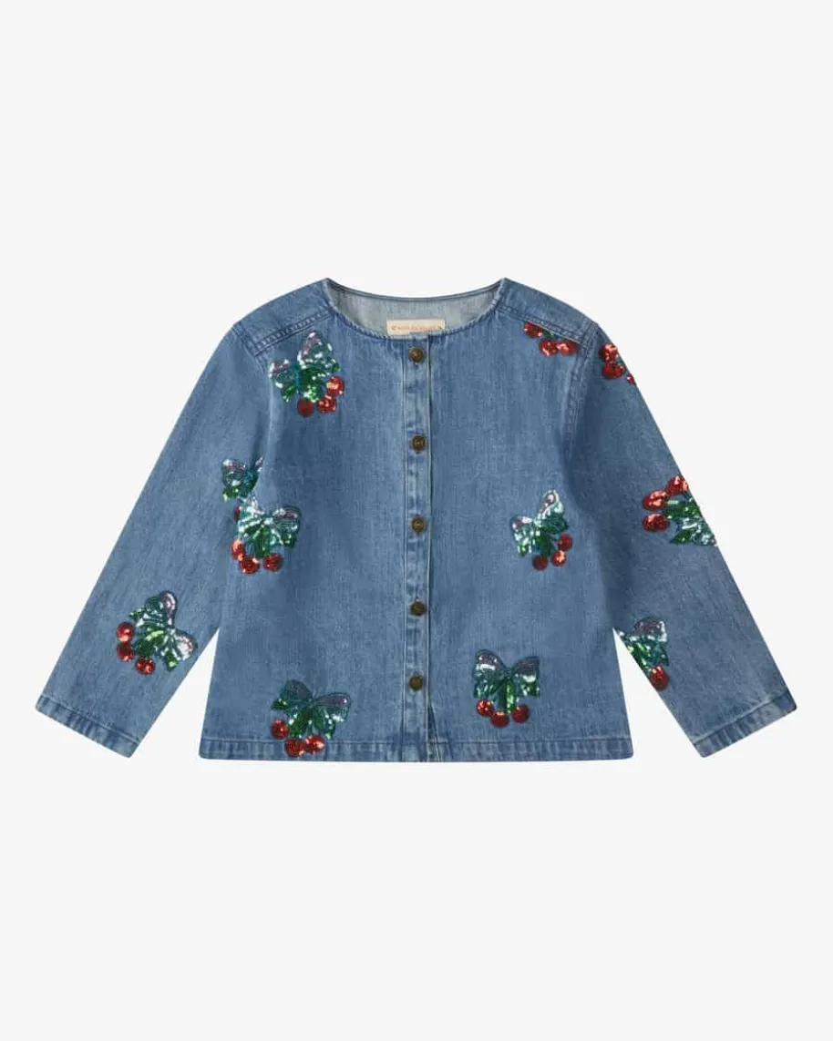 Amarena Jeansjacke für Mädchen von Konges Slojd in Blau, Rot und Grün. DänischesDesign für Babys & Kinder – nachhaltig, stylisch, durchdacht. Auch dieses Modellbegeistert mit GOTS zertifiziertem Baumwoll-Denim, während die süßen Pailletten-Applikationen mit Kirschen-Motiv den niedlichen Style harmonisch abrunden.