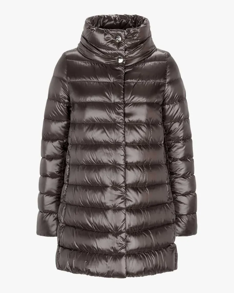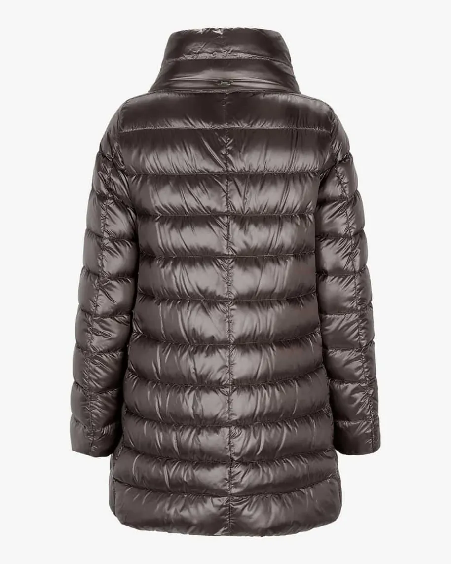 Amelia Daunenmantel für Damen von Herno in Dunkelbraun. Das italienische Labelhatsich mit seinen besonders weichen und leichten Daunen-Modellen einen Namen inder Modebranche gemacht und ist für Liebhaber nicht mehr wegzudenken. DieserKlassiker präsentiert sich in gewohnt changierender Stepp-Optik und hält ankalten Tagen nicht nur warm, sondern punktet auch durch die modische A-LinienPassform.