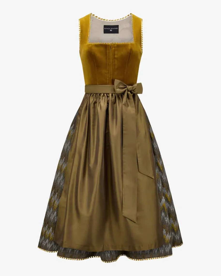 Ancona Dirndl lang mit Schürze für Damen von Kinga Mathe inOcker und Braun. MitLiebe zum Detail entwirft das deutsche Label aufwendigeTrachten-Kreationen mitdem gewissen Etwas und überzeugt mit erlesener Stoffauswahlsowie kreativeDesigns. Das Modell überzeugt mit klassischem Mieder aushochwertigem Baumwoll-Samt, während der Unterrock eine feminine Passform verleiht.Die changierendeSchürze aus Satin komplettiert das abstrakte Allover-Dessindes Dirndlsharmonisch.