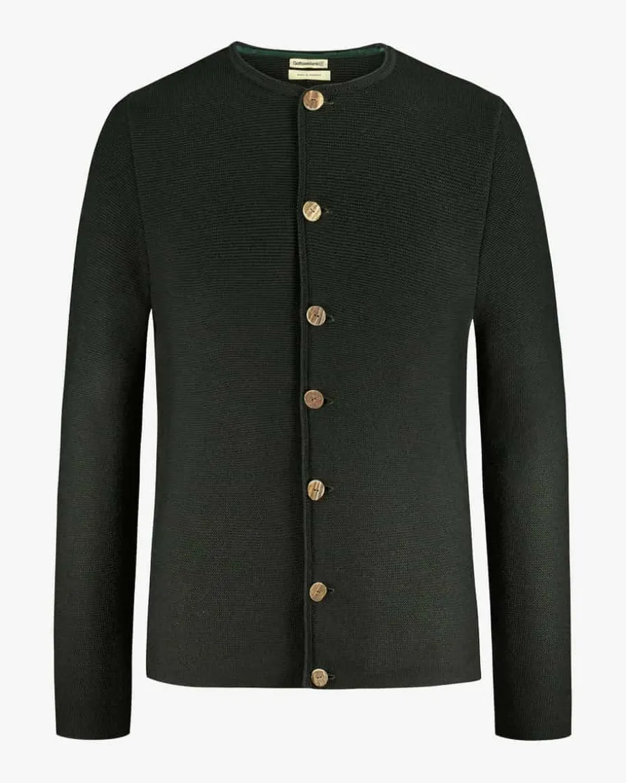 Anselm Trachten-Strickjacke für Herren von Gottseidank in Dunkelgrün. Tracht mitCharakter- Dank der Verwendung von extrafeiner Merinowolle besticht das legere Modell mitangenehmem Tragekomfort, während das klassische Strickmuster den traditionellenCharakter gekonnt ergänzt. Zugleich untermalen rustikale Horn-Knöpfe dasGesamtbild harmonisch.