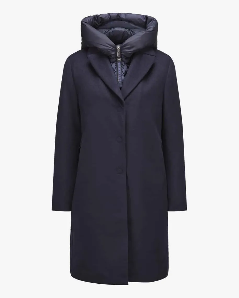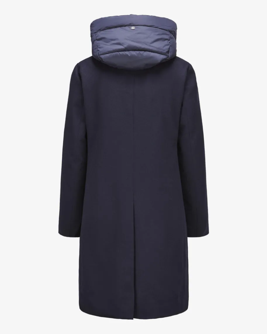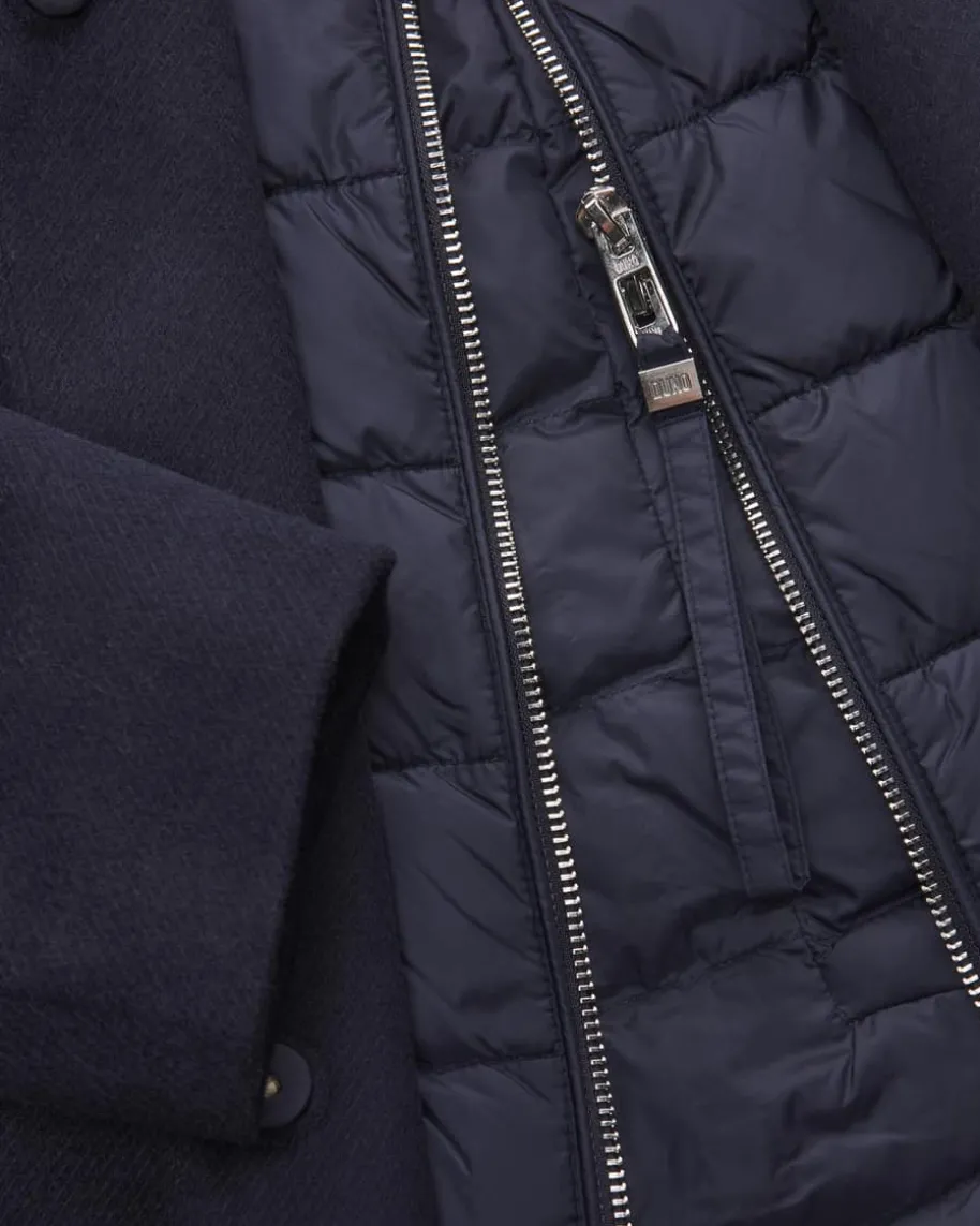 Artemide Daunen-Wollmantel für Damen von Duno in Navy. Made in Italy – Die Markekombiniert funktionale Outerwear mit italienischer Schneiderkunst und einemzeitgemäßen, urbanen Stil. Auch dieses Hybrid-Modell überzeugt dank der leichtenDaunen-Feder-Füllung sowie der heraustrennbaren Steppblende als wärmenderBegleiter mit stilvollem Touch, den Sie je nach Wetterbedingung und Anlass edeloder sportiv stylen können.