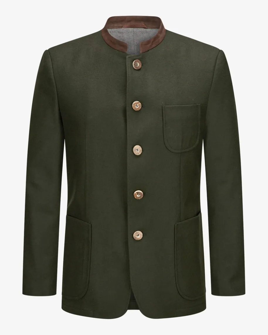 Aschau Trachten-Janker für Herren von LODENFREY in Moosgrün. Das Modell inantaillierter Passform und traditionellem Charakter erweist sich als idealerBegleiter in typischer Trachten-Aufmachung, während rustikale Hornknöpfe und derkontrastfarbige Stehkragen aus Leder das Gesamtbild gekonnt vollenden.