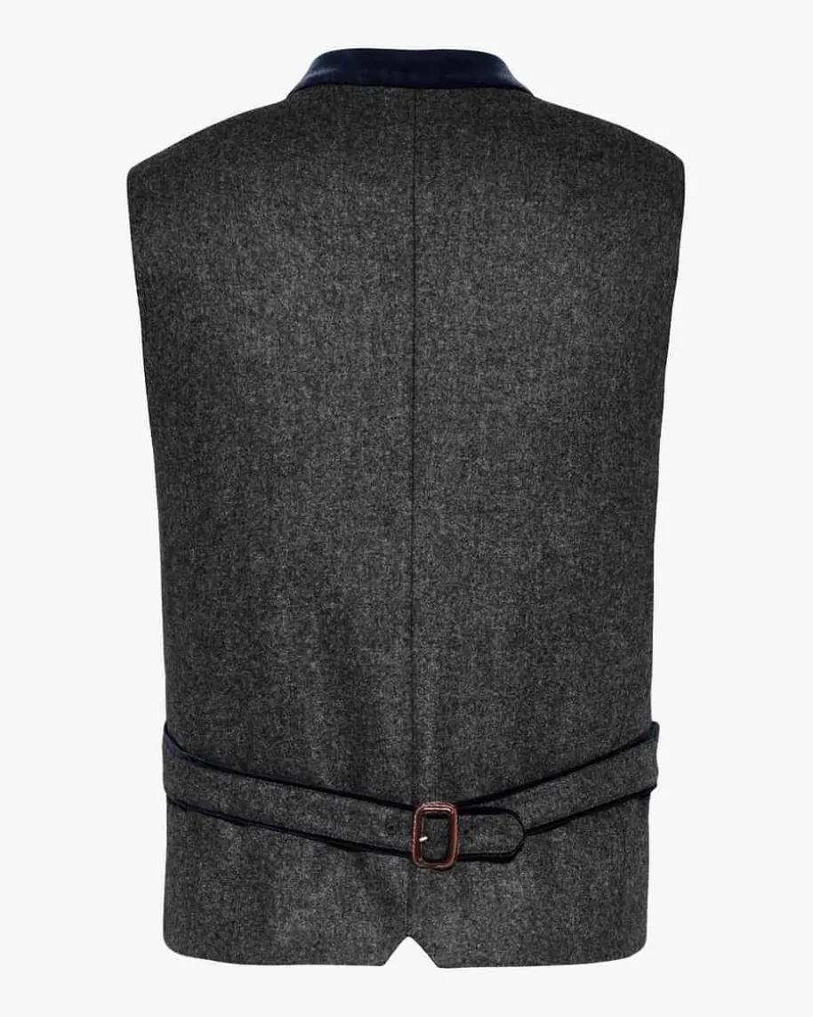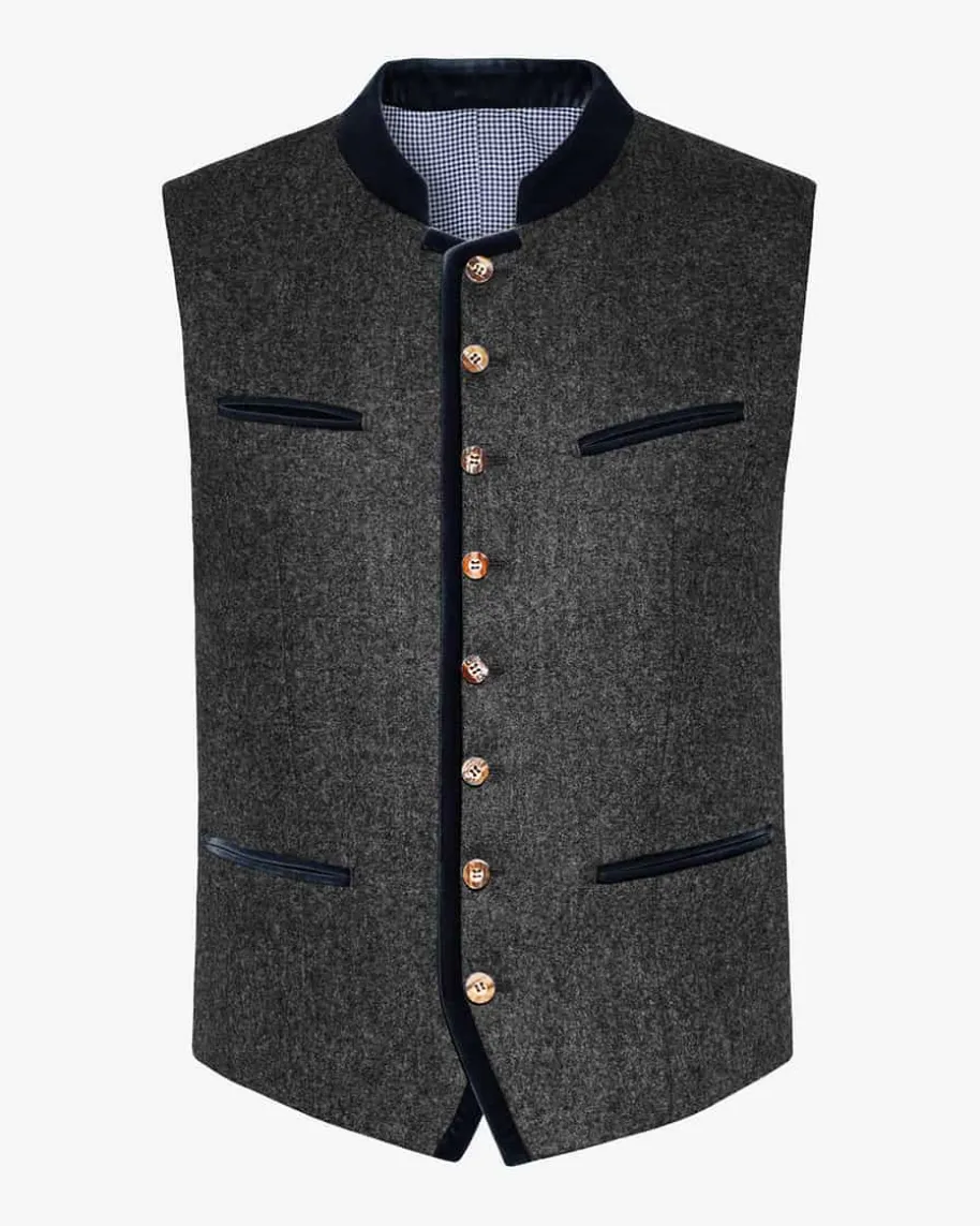 Au Trachtenweste für Herren von Windsor in Grau und Dunkelblau. Dasmodische Gilet aus italienischem Wolltuch und mit Samt-Paspeln überzeugt mitedlen Details und rustikalen Akzenten, während echte Hirschhorn-Knöpfe einenklassischen Blickfang für modische Trachten-Looks schaffen.