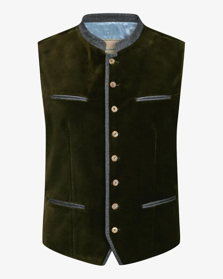 Au Trachtenweste für Herren von Windsor in Oliv und Anthrazit. Das Modell ausweichem Baumwoll-Samt überzeugt mit edlen Details und traditionellen Akzenten,während echte Hornknöpfe einen klassischen Blickfang für modische Trachten-Looksschaffen.