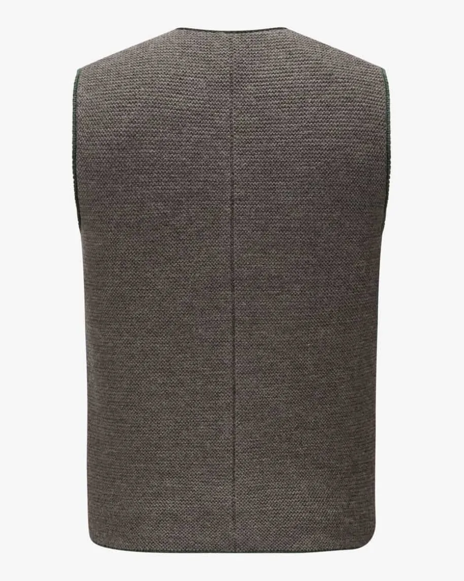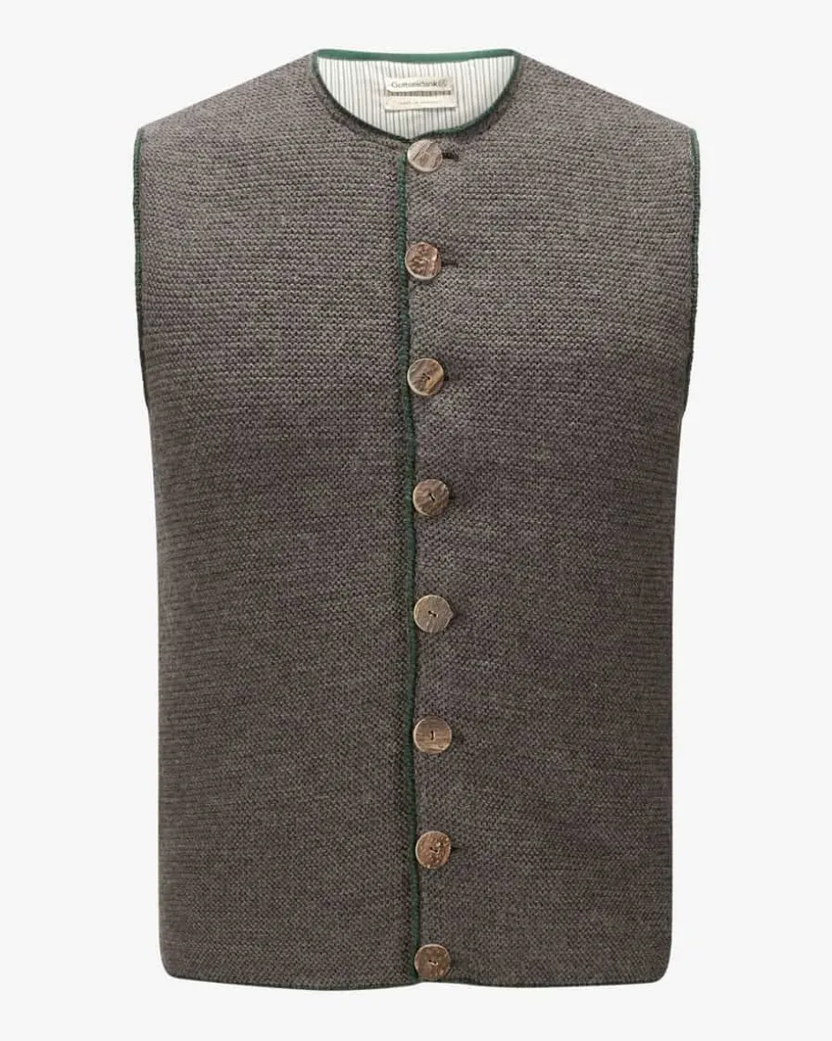 August Trachten-Strickweste für Herren von Gottseidank in Graubraun undDunkelgrün.Tracht mitCharakter – Fein gestrickt und aus hochwertiger Schurwolle überzeugt das Modellin traditioneller Aufmachung, während Hornknöpfe und Paspelierungen denTrachten-Look stilvoll ergänzen.