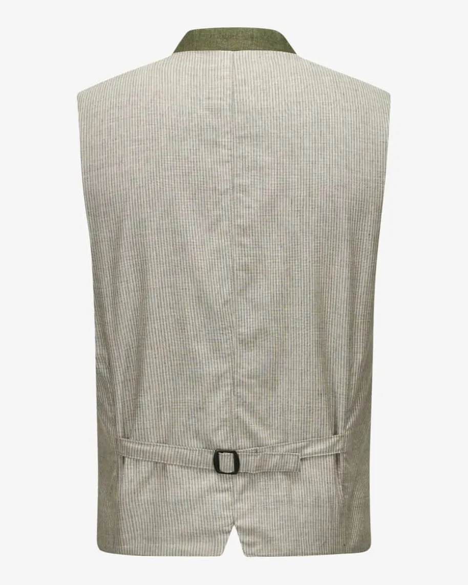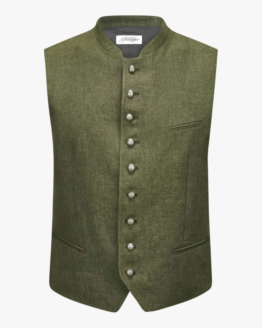Aurach 5 Trachtenweste für Herren von Grasegger Manufaktur in Dunkeloliv, Blauund Hellgrau. Das Modell präsentiert sich mit fein strukturierter Front inLeinen-Qualität und Rückenteil in stilvollem Streifen-Dessin, währendtraditionelle Details den Trachten-Look gekonnt abrunden.