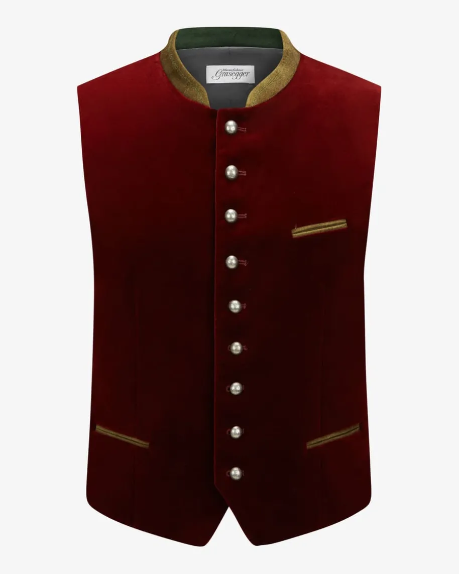 Aurach Samt-Trachtenweste für Herren von Grasegger Manufaktur in Bordeaux, Grünund Rot. Weicher Baumwoll-Samt auf der Vorderseite, der zeitlose Schnitt sowiedie filigranen Stickereien am Stehkragen machen die Weste zum stilsicherenBegleiter zur Lederhose. Die kontrastfarbene Rückseite aus changierendem Taftmit feinem Blättermuster verleihen dem Trachten-Look das gewisse Etwas.