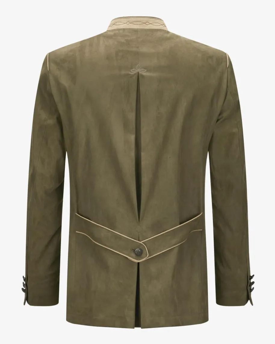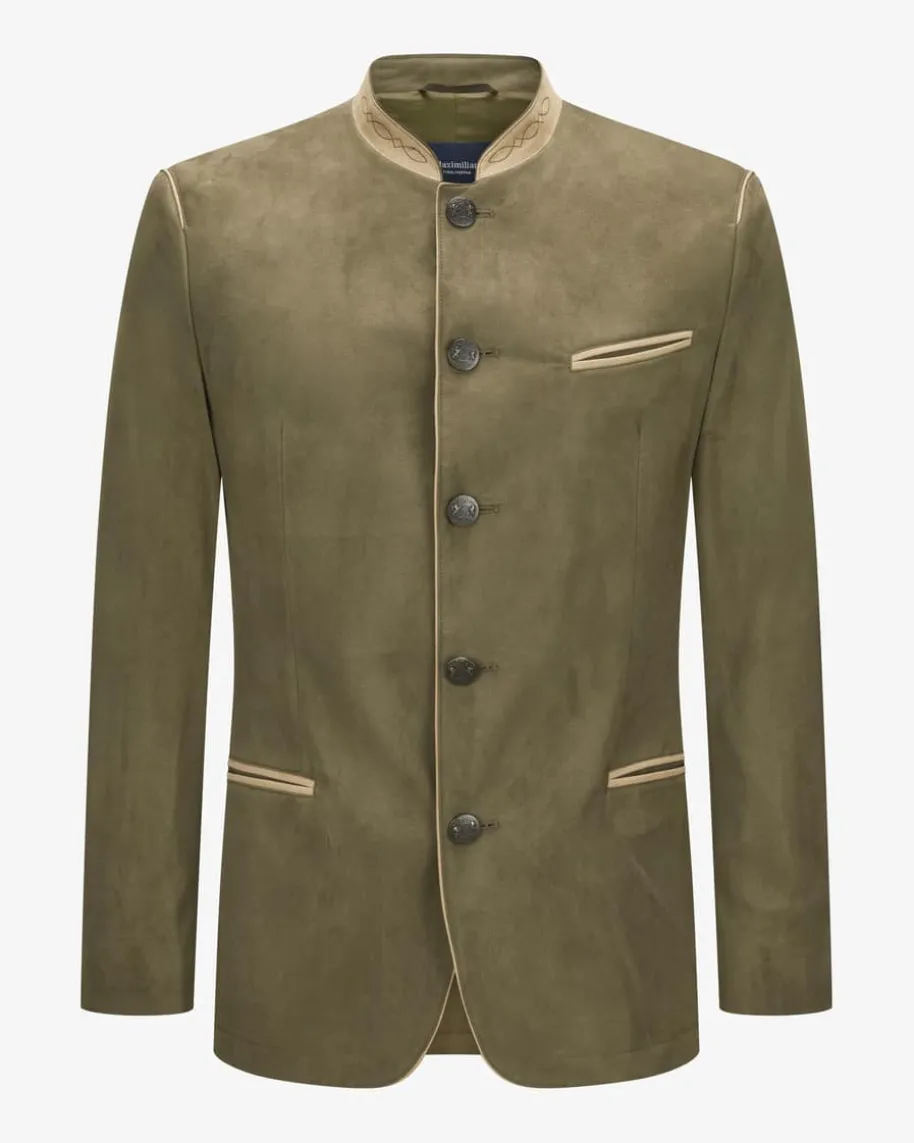 Aurach Trachtenjanker für Herren von Maximilian in Oliv und Schilf. Diestilvolle Aufmachung in Veloursleder-Optik verleiht dem traditionellen Modelleinen eleganten und zugleich rustikalen Look, der von den Wappenknöpfen und denRelief-Stickereien perfekt in Szene gesetzt wird.