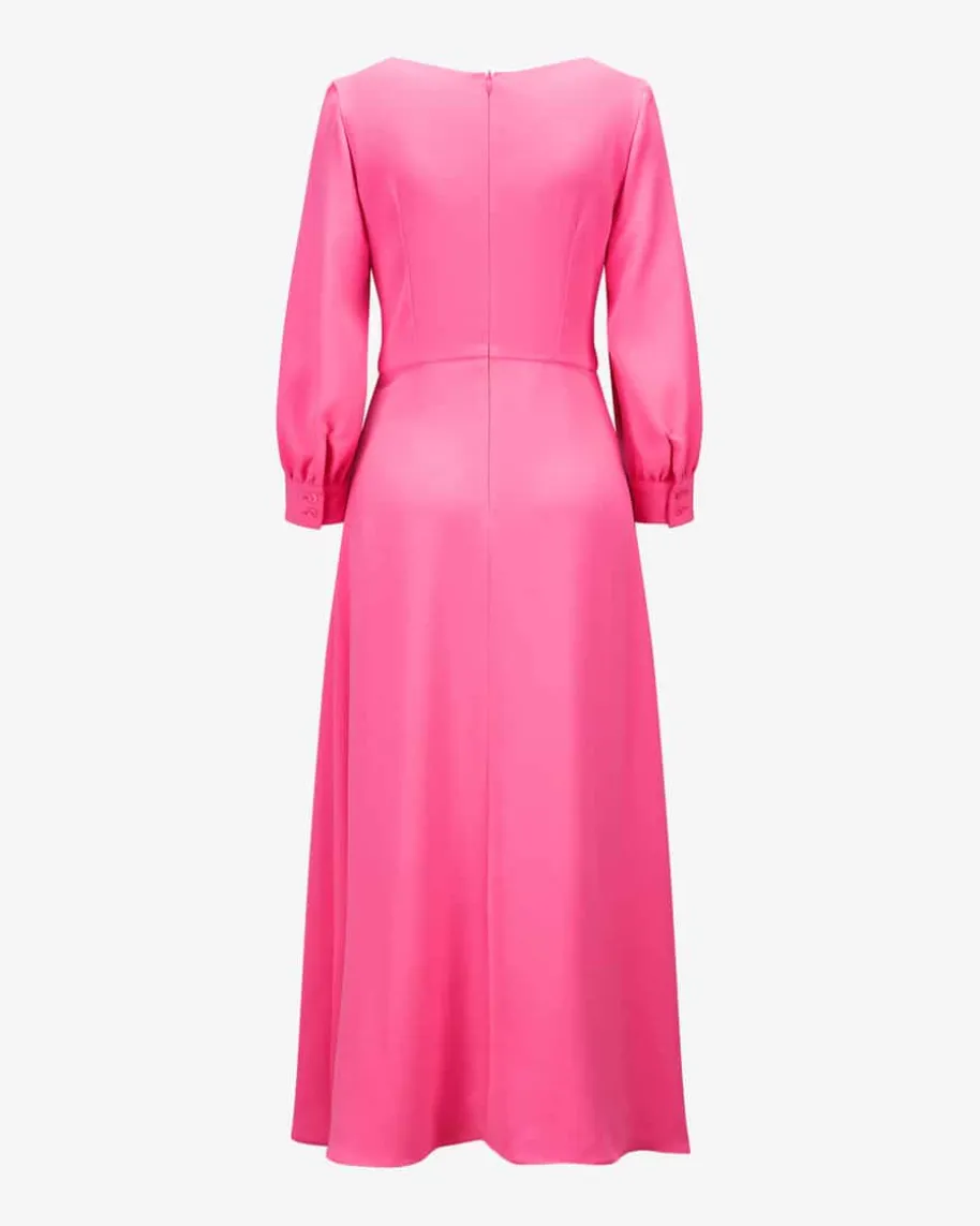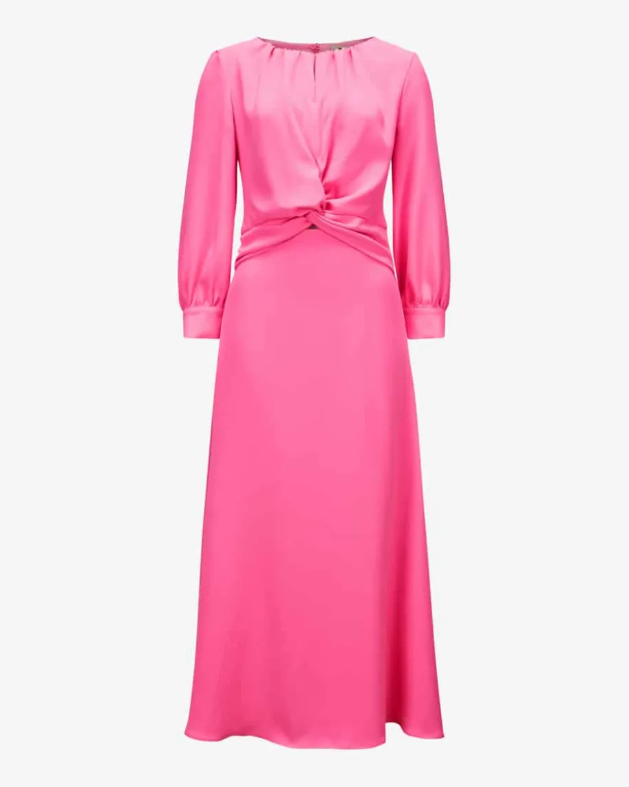 Ava Maxikleid für Damen von Natan in Rosa. Das Modell aus fließenderMaterial-Qualität präsentiert sich in feminin-eleganter Aufmachung, welche durchklassische Elemente sowie dem raffinierten Knoten-Detail mit besonderem Charmein Szene gesetzt wird.