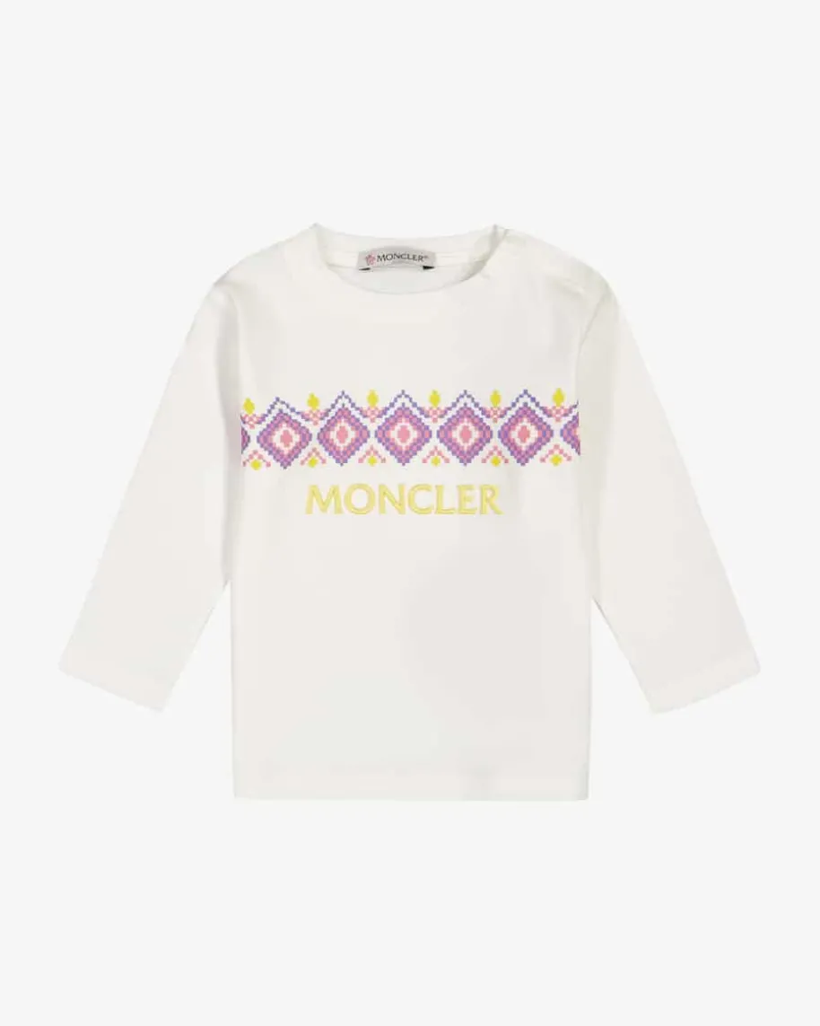 Baby-Longsleeve von Moncler Enfant in Weiß und Bunt. Das Modell besticht dankder Baumwoll-Qualität mit angenehmem Tragekomfort, während der kontrastierendePrint auf der Front sowie die changierende Logo-Stickerei auf dem Ärmel dasGesamtbild harmonisch vollenden.