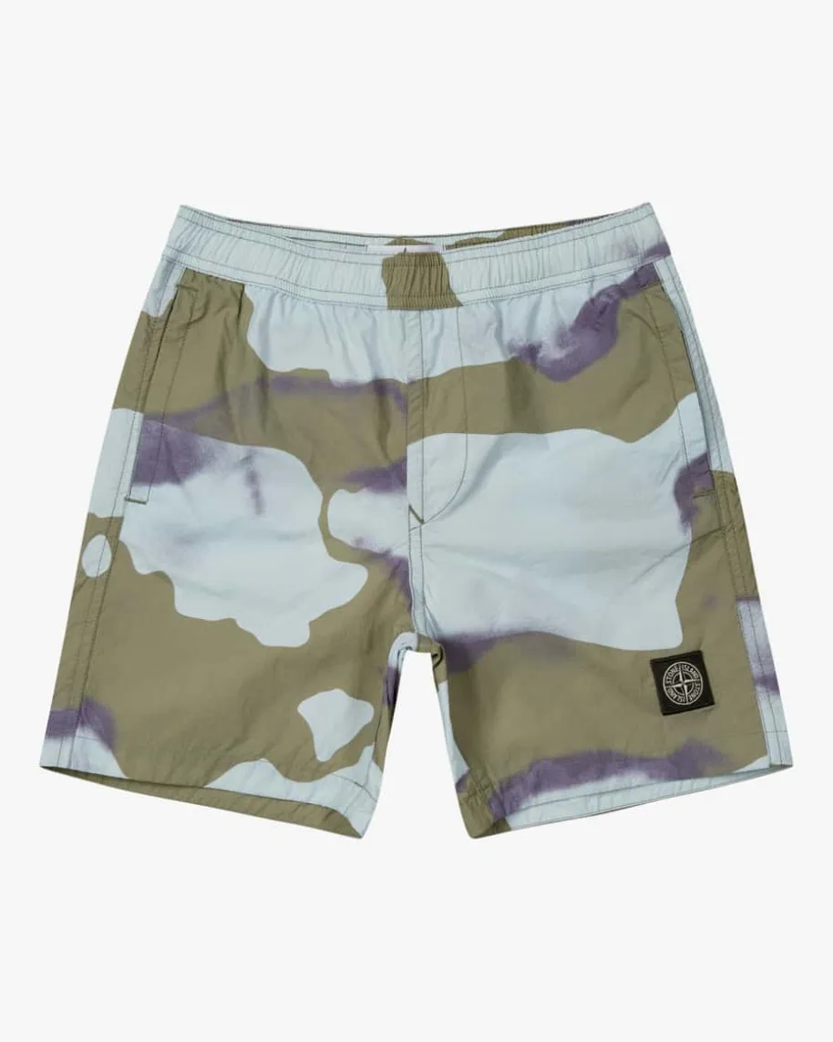 Badehose für Jungen von Stone Island Junior in Oliv, Hellblau und Violett. DasModell in klassischem Schnitt überzeugt mit modernem Camouflage-Print, währenddie klassischen Details und das Logo-Emblem einen treuen Badebegleiter kreieren.