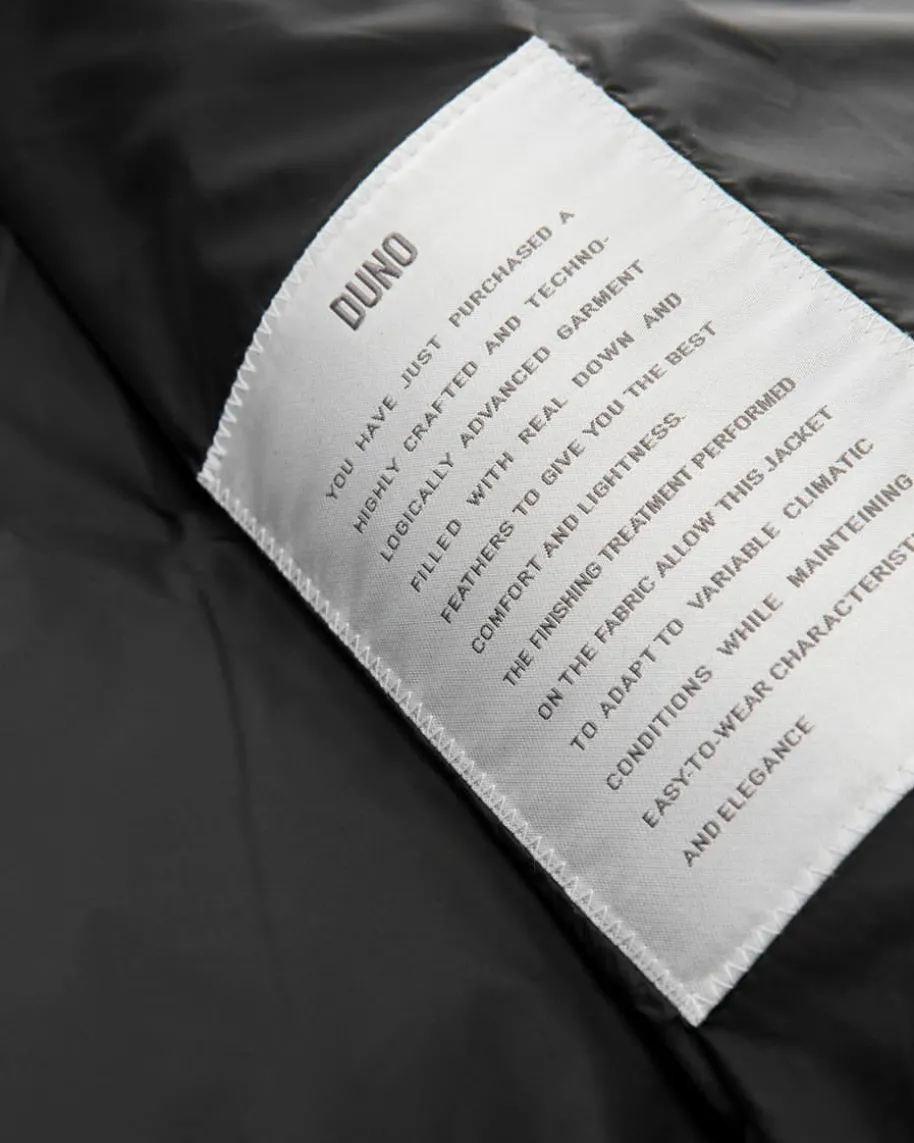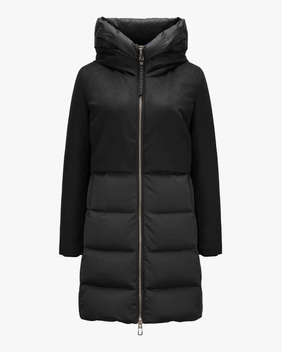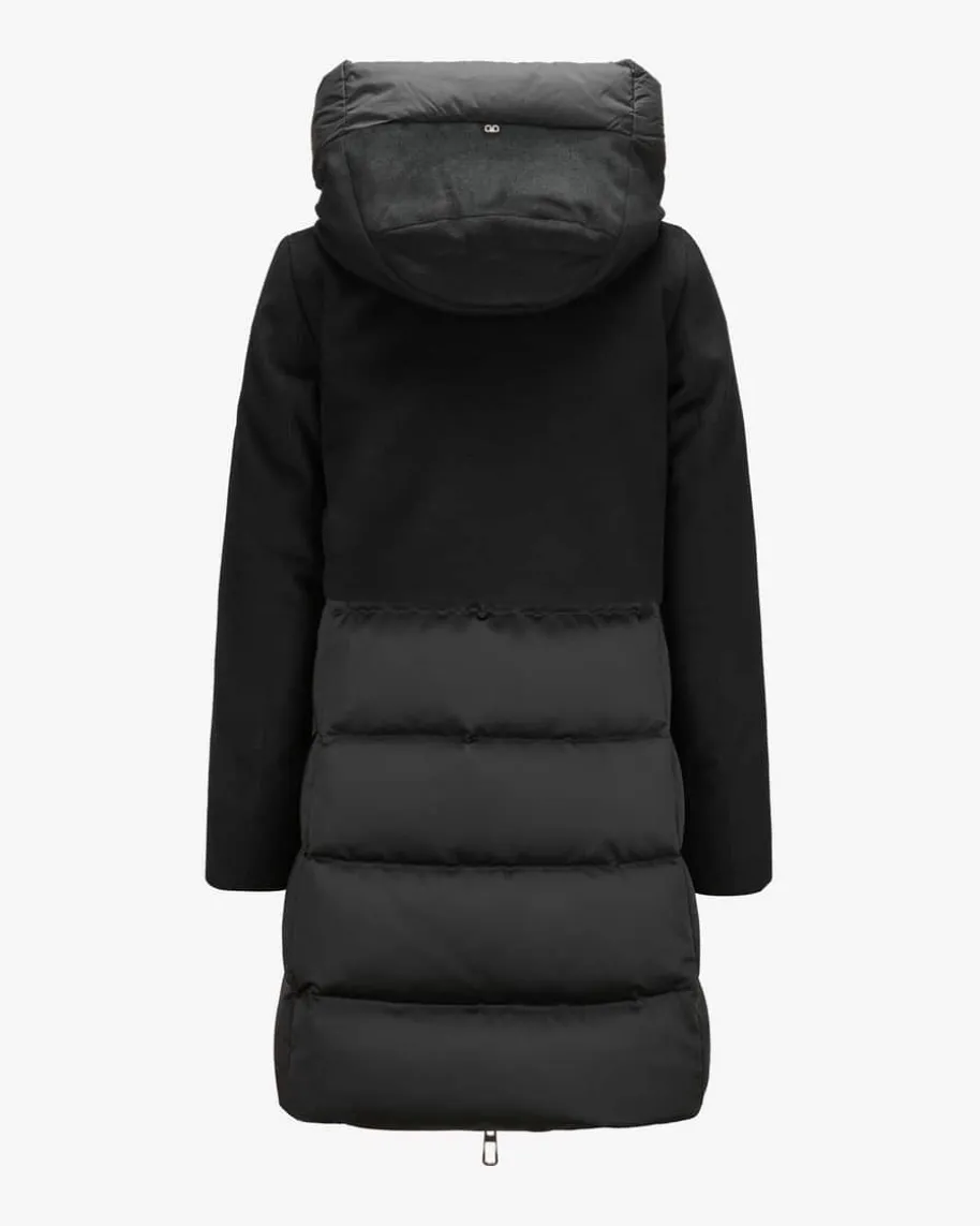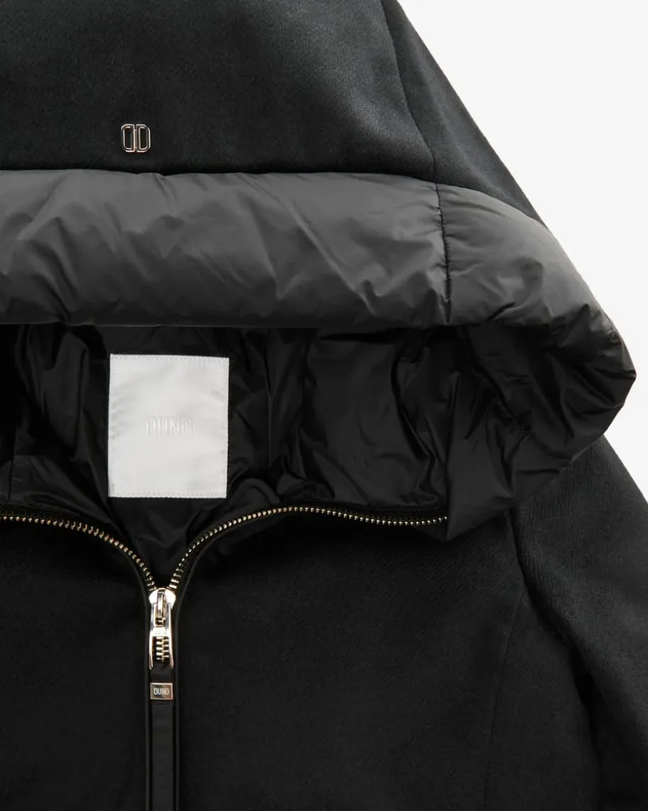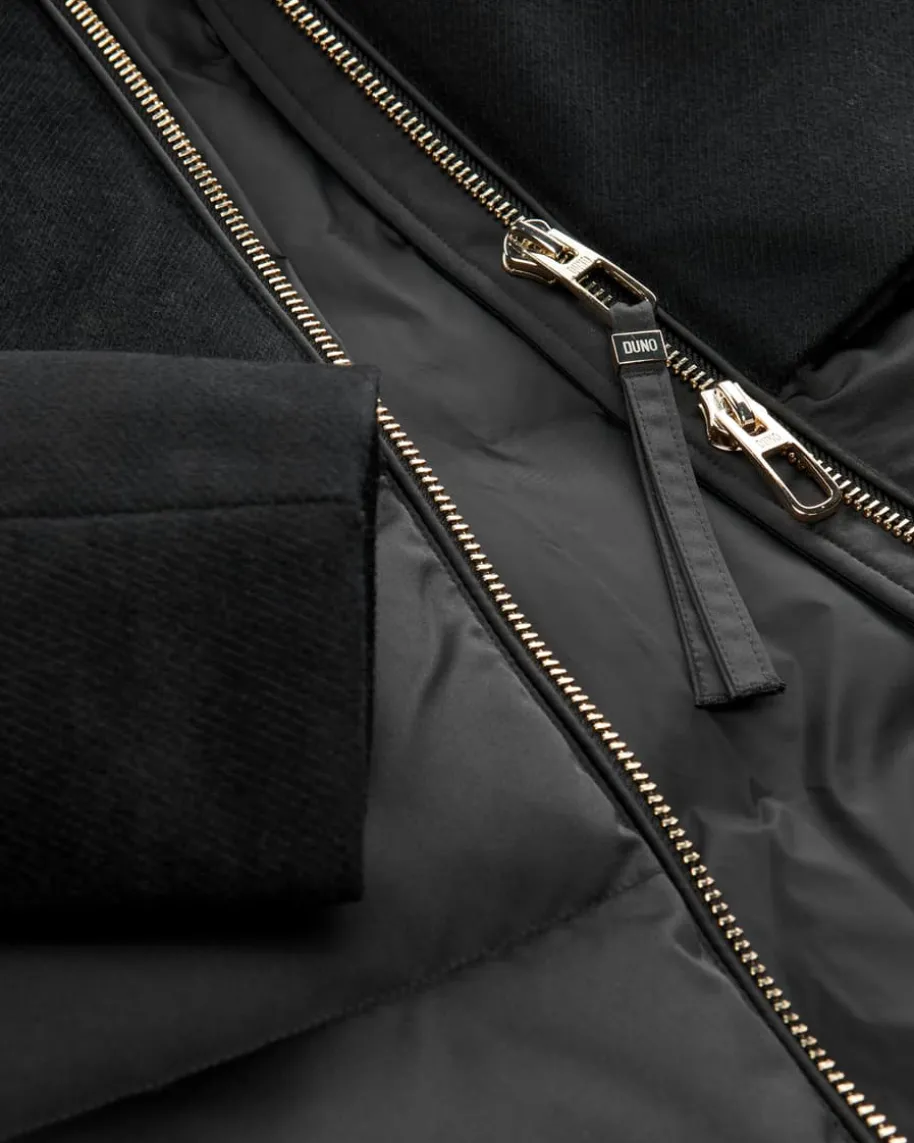 Daunenmantel für Damen von Duno in Schwarz. Das Modell begeistert durch dieextravagante Kombination aus changierendem Stepp-Muster und einer Woll-Mix-Partie, welche mit weichem Griff begeistert und zugleich edle Akzente setzt.Gleichzeitig verspricht die hochwertige Daunen-Feder-Füllung optimalen Schutz ankalten Tagen.