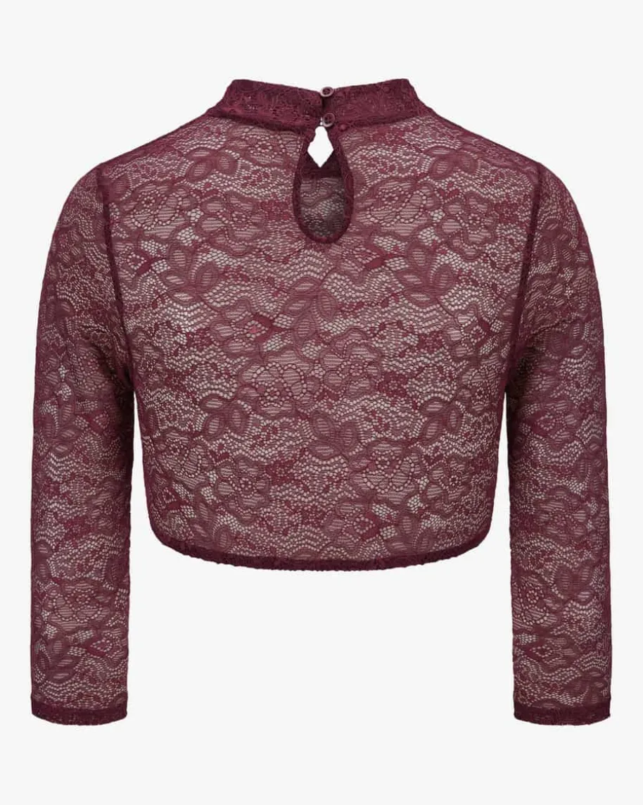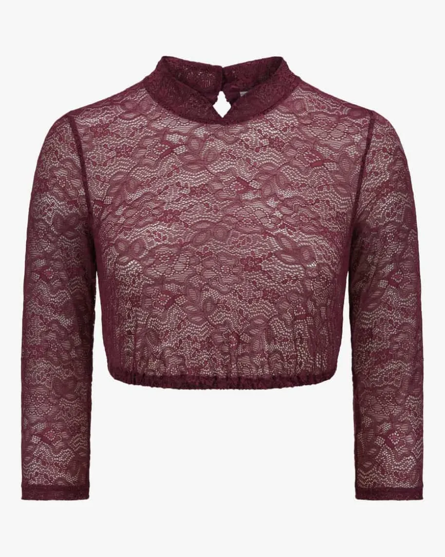 Barbara Dirndlbluse für Damen von LODENFREY München 1842 in Bordeaux. Dassemitransparente Modell begeistert dank des floralen Spitzen-Designs sowie demdezenten Stehkragen, während der elastische Saum perfekten Tragekomfortverspricht.