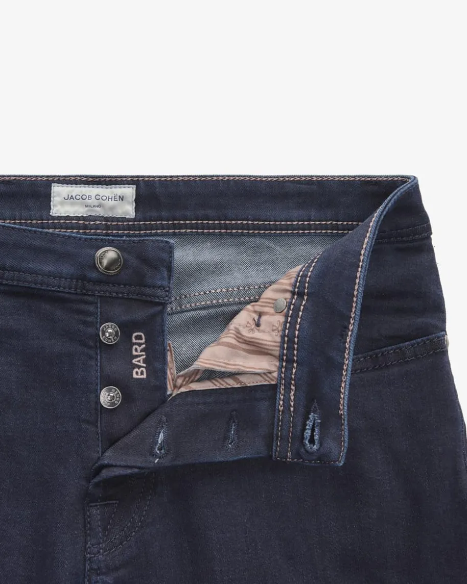 Bard Jeans Slim Fit für Herren von Jacob Cohen in Nachtblau. Made in Italy -Dank hochwertigem und elastischem Baumwoll-Lyocell-Mix erhält das schmalgeschnittene Modell eine softe Denim-Haptik und garantiert zugleich hohenTragekomfort, während die klassische Waschung in Kombination mit labeltypischenDetails einen zeitlosen Alltags-Favoriten schafft.