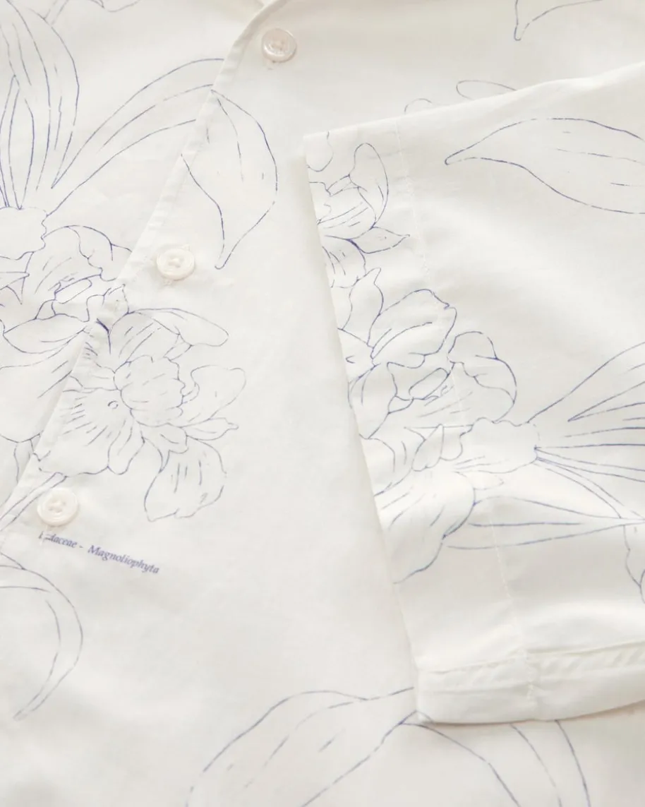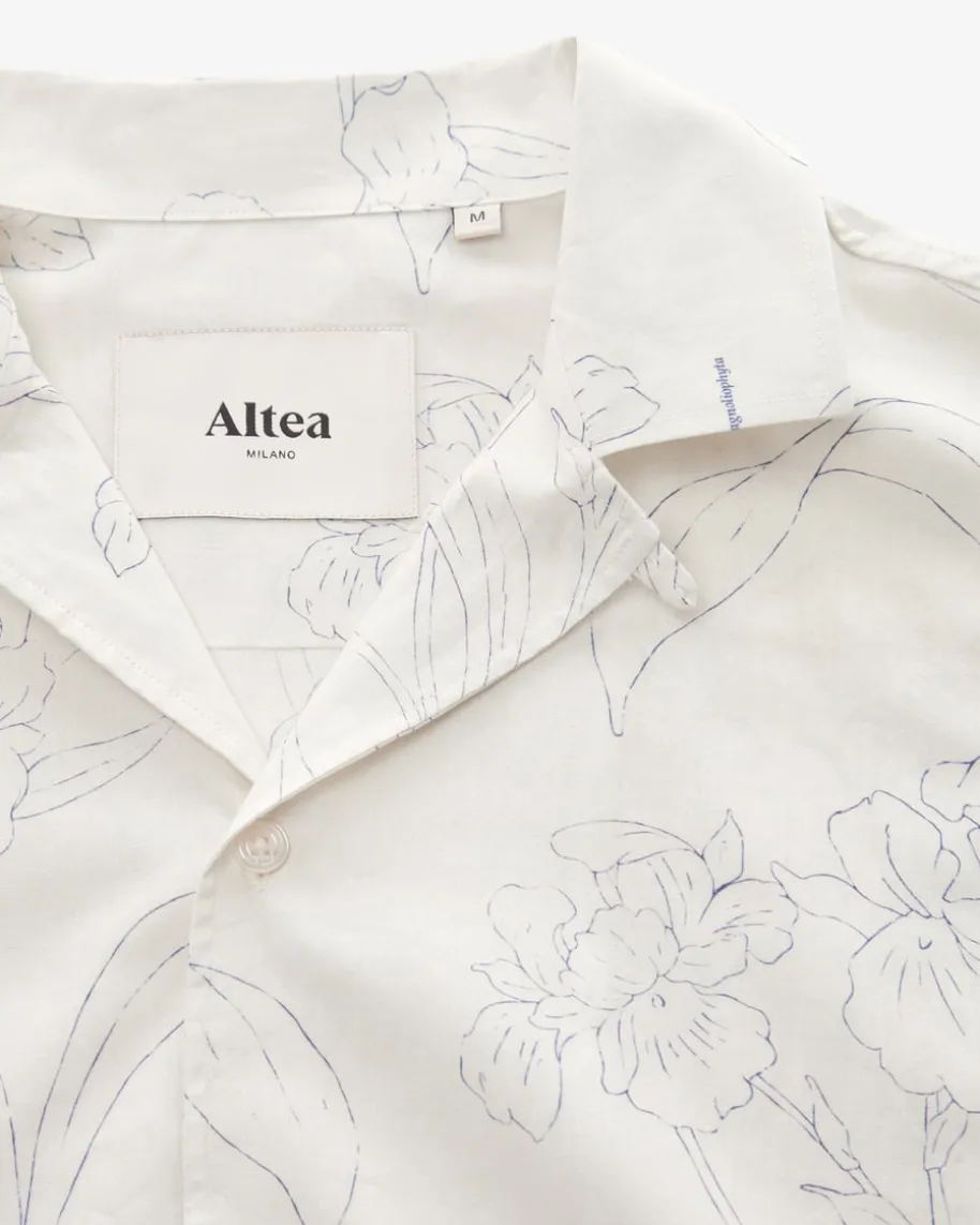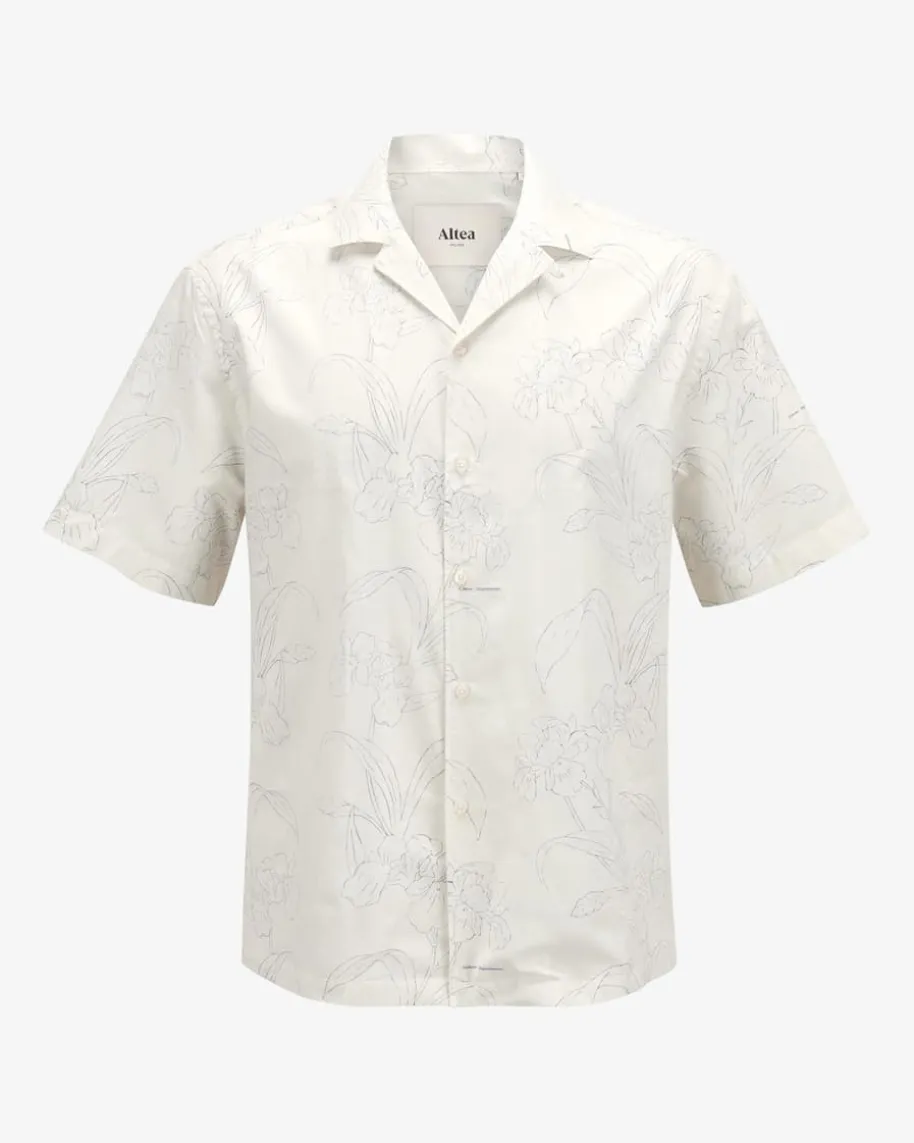 Bart Bowlinghemd für Herren von Altea in Off-White und Blau. Das Kurzarm-Modellavanciert dank der leichten Baumwoll-Qualität zu einem legeren Begleiter mithohem Tragekomfort, welcher durch das filigrane, florale Muster einen besonderenCharakter erhält.