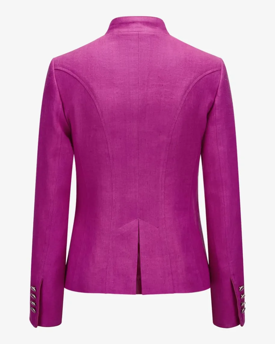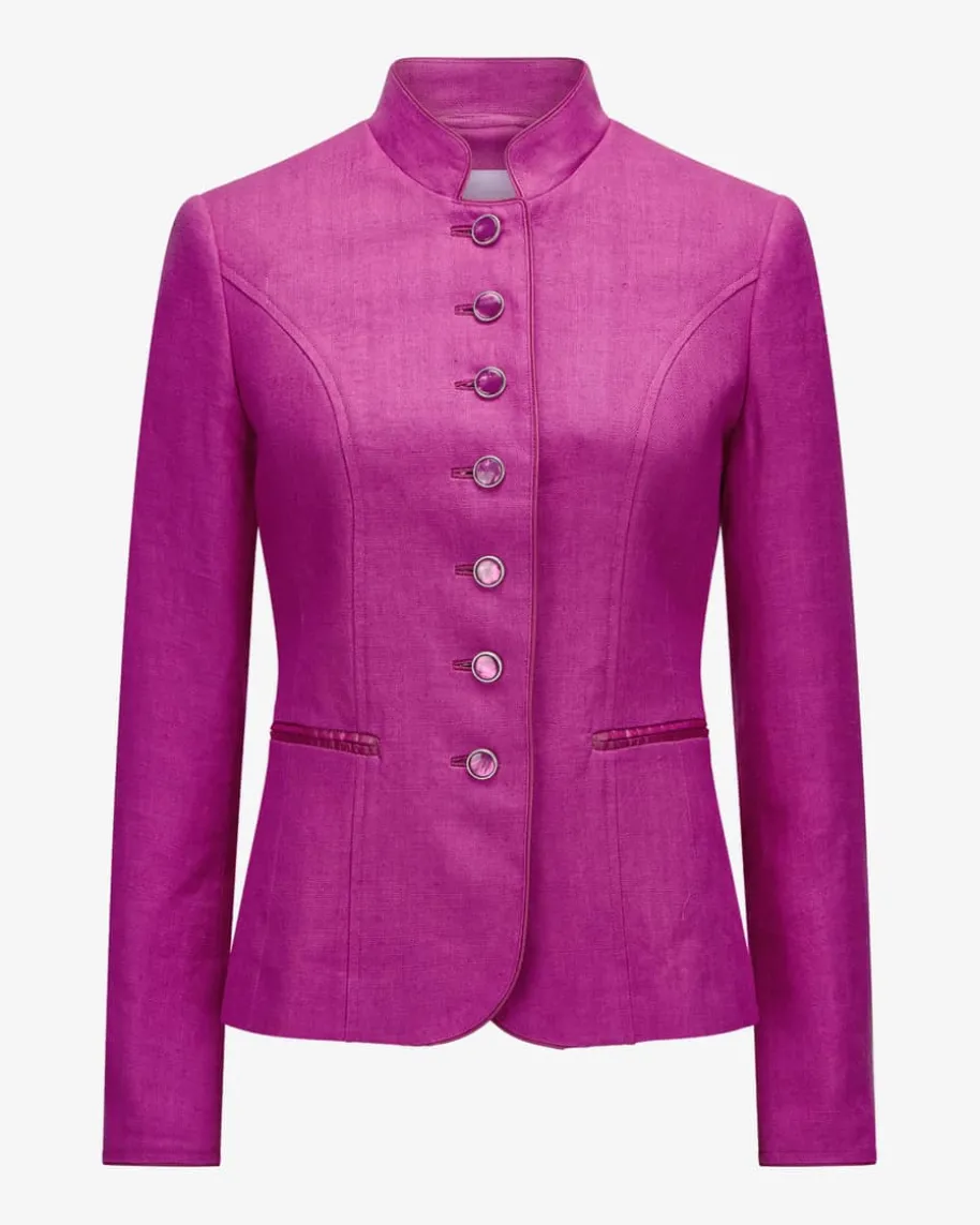 Bern Trachtenblazer für Damen von LODENFREY München 1842 in Himbeere. Aushochwertiger Leinen-Qualität gefertigt, präsentiert sich das taillierte Modelldank toniger Paspelierungen, changierender Knöpfe sowie des klassischen Designsin traditionell-authentischer Aufmachung.