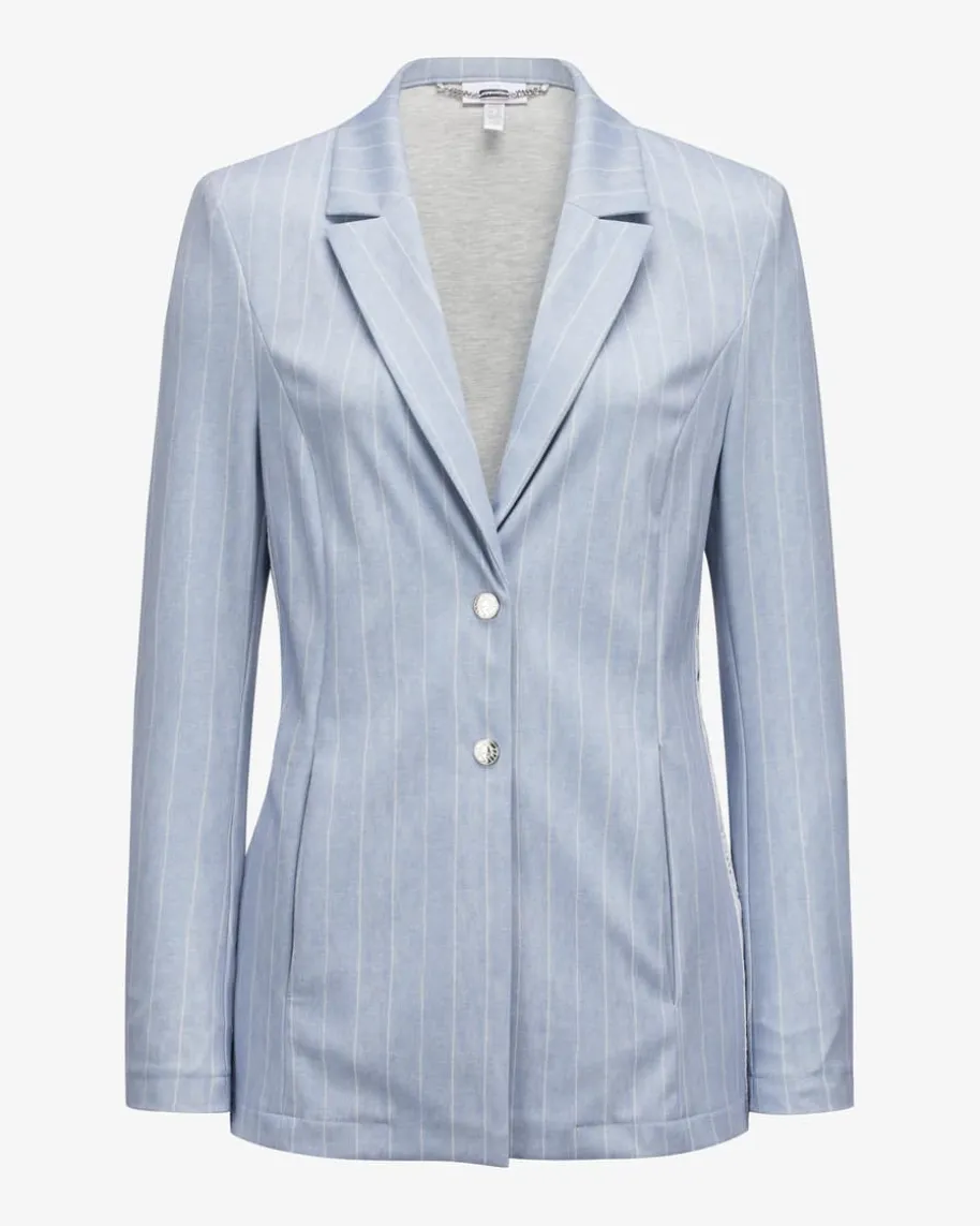 Blazer für Damen von Sportalm in Hellblau und Weiß. Das Modell präsentiert sichdank der elastischen Material-Qualität sowie des Streifen-Designs mit seitlichenLogo-Borten als modischer Favorit für Office- oder Alltags-Looks mit demgewissen Etwas.