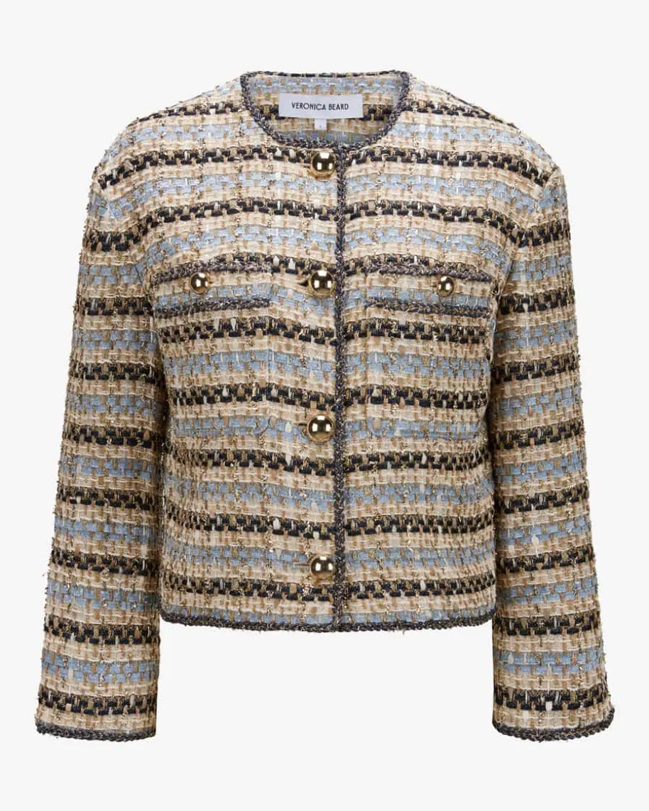 Sumira Blazer für Damen von Veronica Beard in Creme, Hellblau und Navy. DieKastenjacke überzeugt durch ihren klassischen Bouclé-Look sowohl haptisch alsauch optisch und avanciert dank der goldfarbenen Kugelknöpfen zum edlenBegleiter für stilsichere Auftritte.