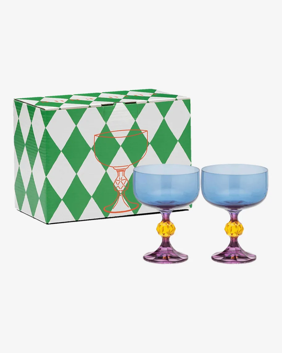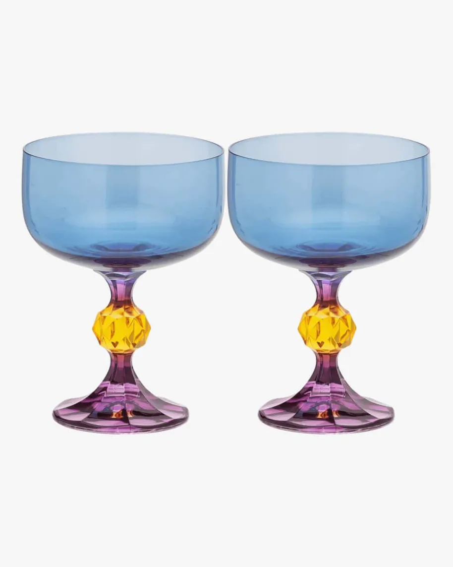 Bliss Cocktailglas-Set von Anna + Nina in Blau, Violett und Gelb. 2012 inAmsterdam gegründet, bringt das Label einen Hauch von Magie mit Liebe zumDetail, Freude und Farbe in den Alltag. Diese Gläser bringen ein farbenfrohesVintage-Flair auf Ihren Esstisch und eignen sich daher perfekt für besondereAbende. Ein ideales Geschenk für Cocktail- und Interieur-Liebhaber.