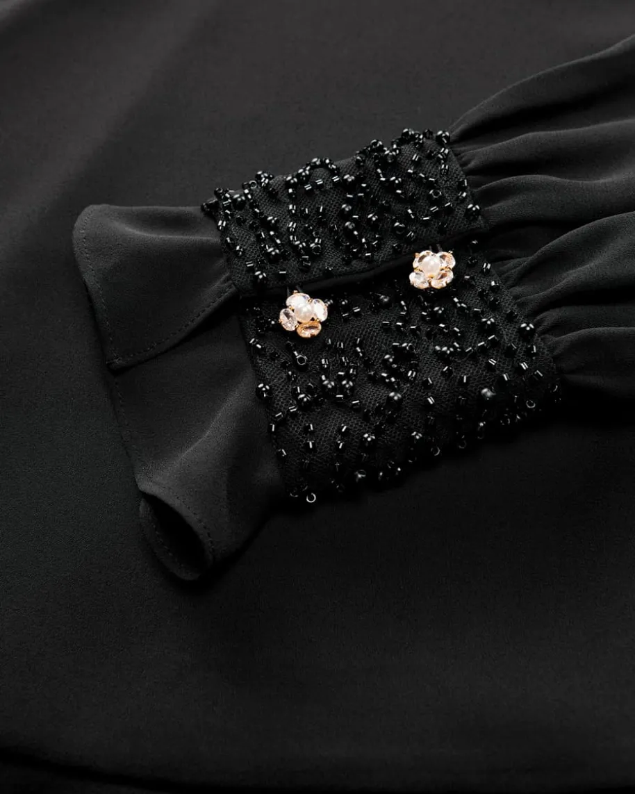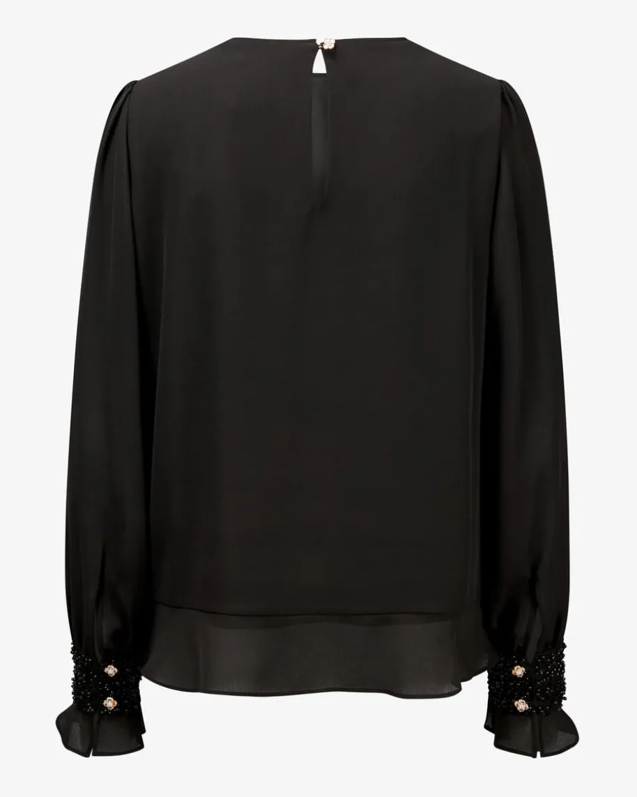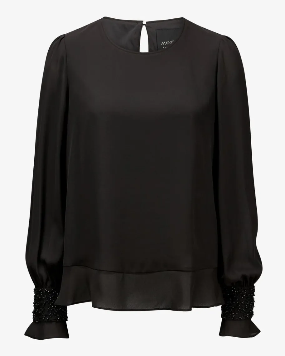 Bluse für Damen von Marc Cain in Schwarz. In semitransparenter Optik bestichtdas Modell in romantischer Aufmachung, während Schmuckstein-Details an den Ärmeldem Gesamtbild das gewisse Etwas verleihen.