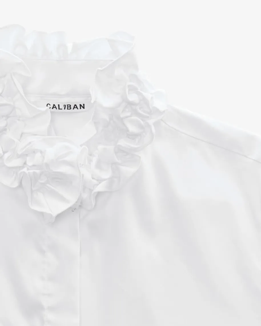 Bluse für Damen von Caliban in Weiß. Das Modell aus elastischer Baumwollepräsentiert sich in femininer Silhouette, während die extravaganten Smok-Abschlüsse einen edlen Charakter verleihen.