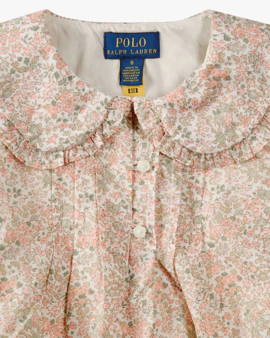 Blusenshirt für Mädchen von Polo Ralph Lauren in Rosa, Salbei und Weiß. Daszweilagige Modell mit zartem Blumenmuster präsentiert sich dank der leichtenBaumwoll-Qualität in angenehmer Haptik, während niedliche Elemente wie derBubikragen mit Rüschen-Details sowie der elastische Saum das Gesamtbildmädchenhaft inszenieren.