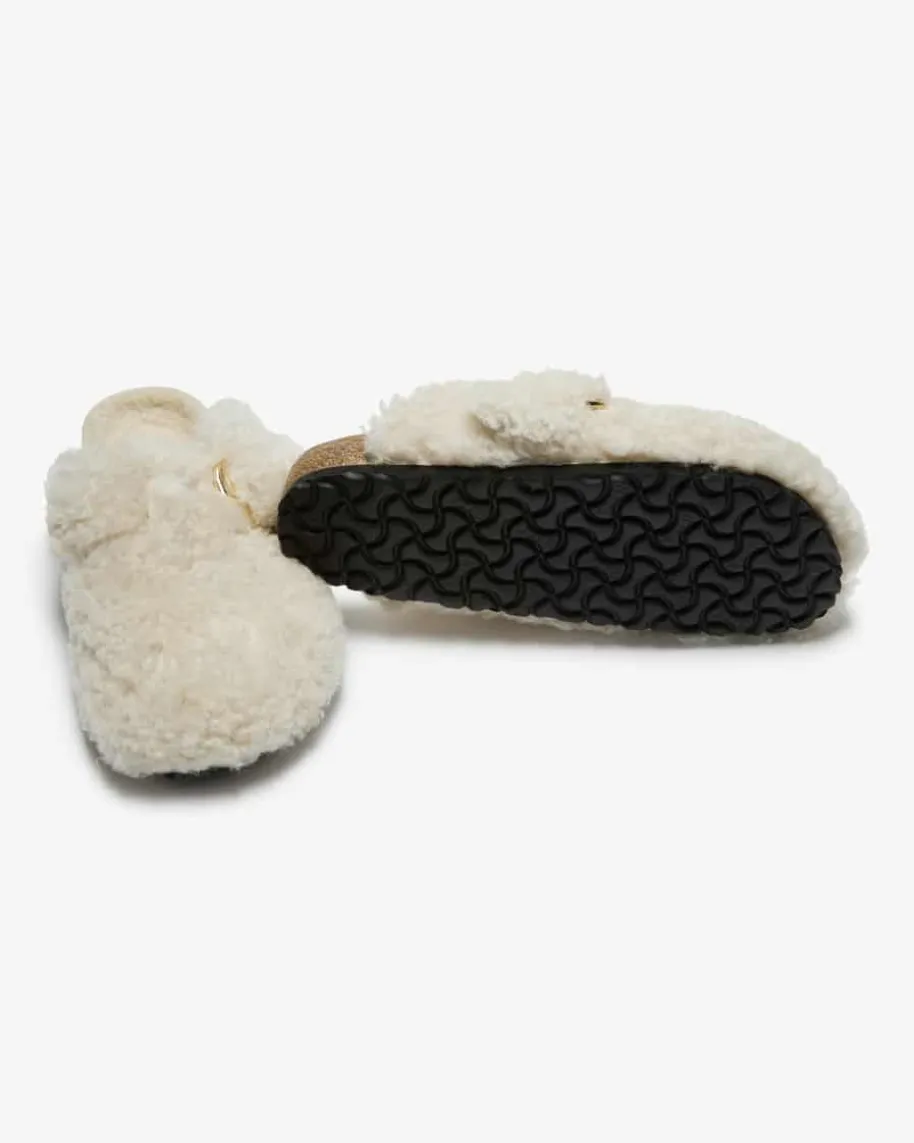 Boston Big Buckle Teddy Pantoletten für Damen von Birkenstock in Creme. Seitüber 200 Jahren revolutioniert Birkenstock die Schuhindustrie immer neu. Mitseinem einzigartigen, anatomischen Fußbett hat Birkenstock ein innovativesProduktkonzept auf den Markt gebracht, das bis heute Bestand hat. Die Lammfell-Qualität macht das Modell in Kombination mit der goldenen Dornschließe zu einemmodischen sowie bequemen Begleiter.