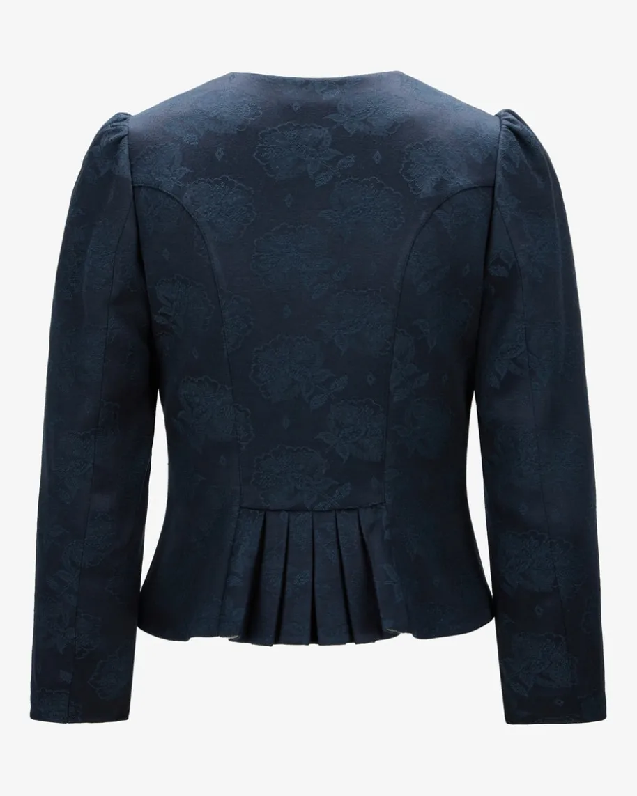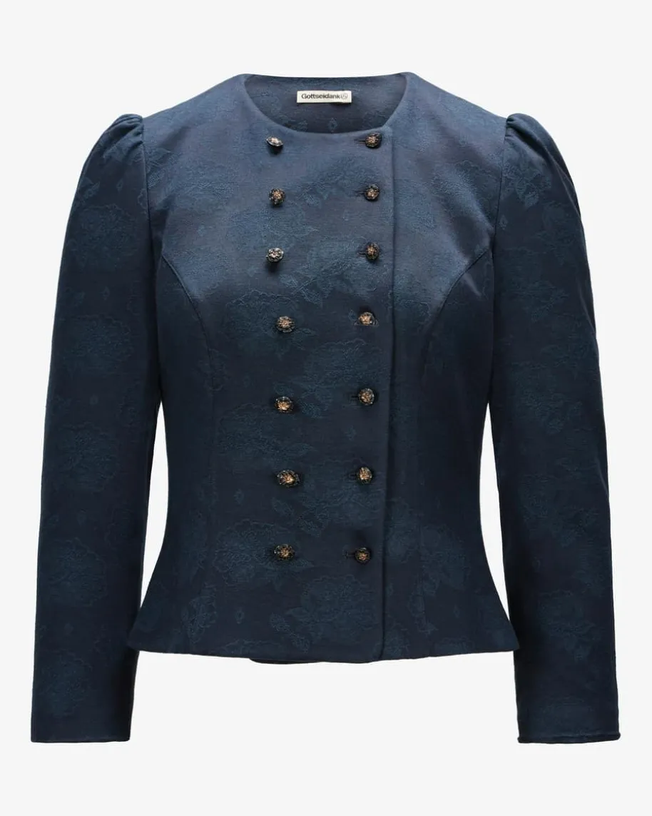 Candela Trachtenblazer für Damen von Gottseidank in Nachtblau. Tradition undModerne in perfektem Zusammenspiel – Das taillierte Modell begeistert dank derfloralem Allover-Dessin sowie changierenden Knöpfen in edler Aufmachung, währendklassische Details sowie das dezente Schößchen ein traditionelles Pieceschaffen.