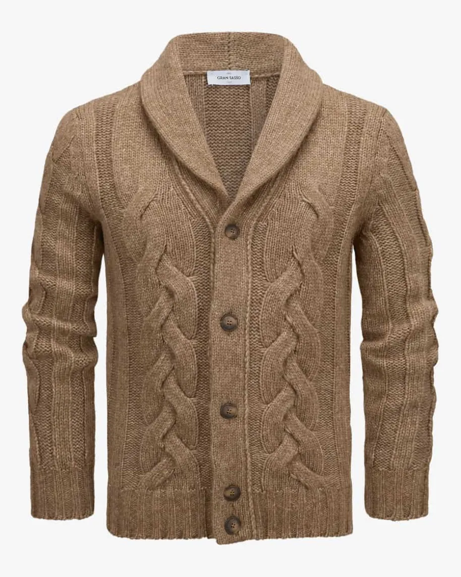Cardigan für Herren von Gran Sasso in Braun. Das Modell in klassischemZopfstrick-Dessin und hochwertigem Schurwoll-Mix sorgt für angenehmeTragemomente, während der Schalkragen das Dessin gekonnt vollendet.