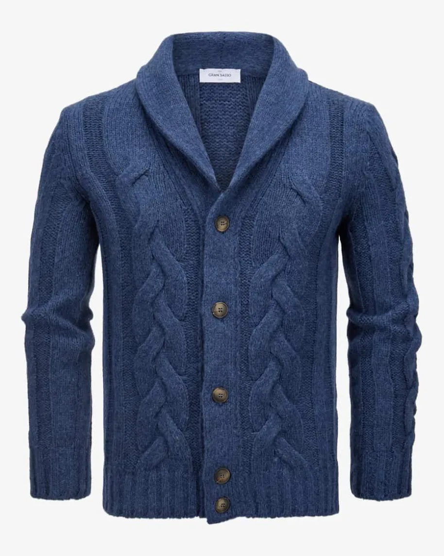 Cardigan für Herren von Gran Sasso in Blau. Das Modell in klassischemZopfstrick-Dessin und hochwertigem Schurwoll-Mix sorgt für angenehmeTragemomente, während der Schalkragen das Dessin gekonnt vollendet.
