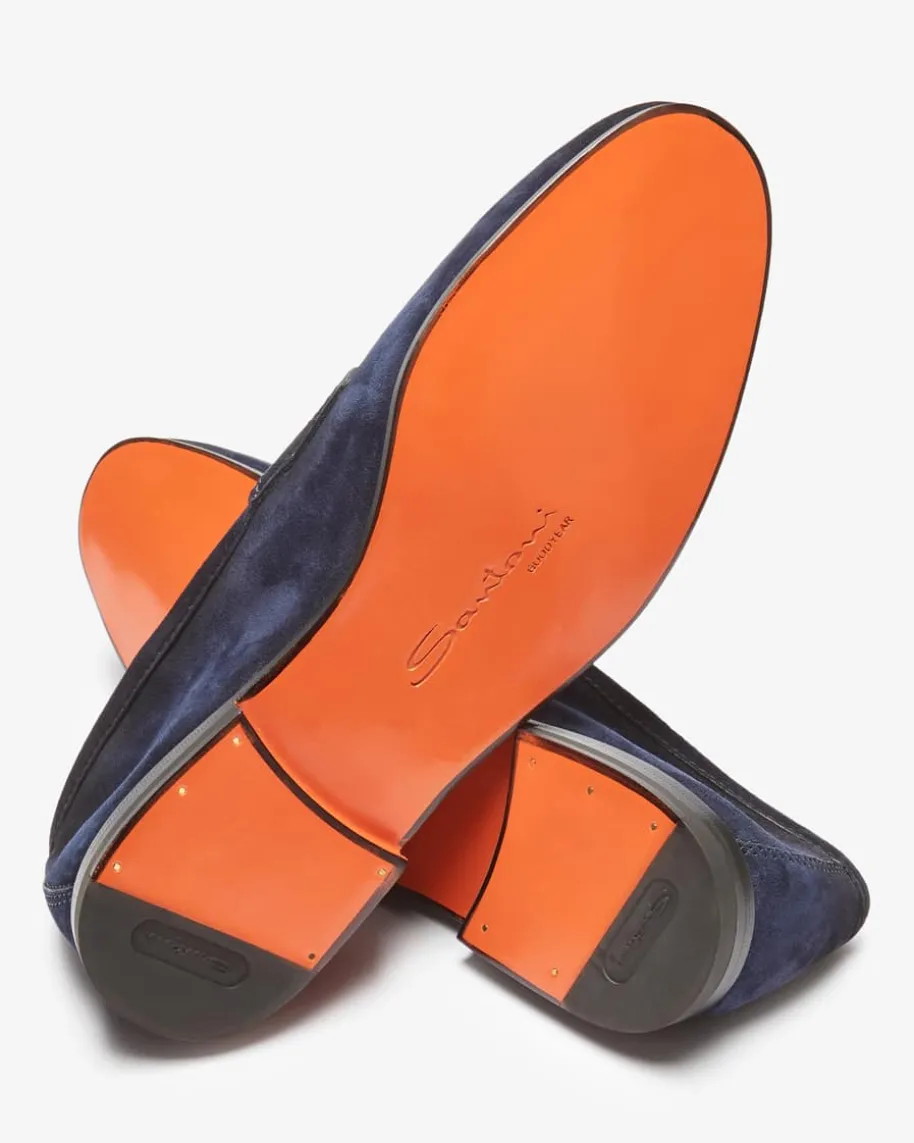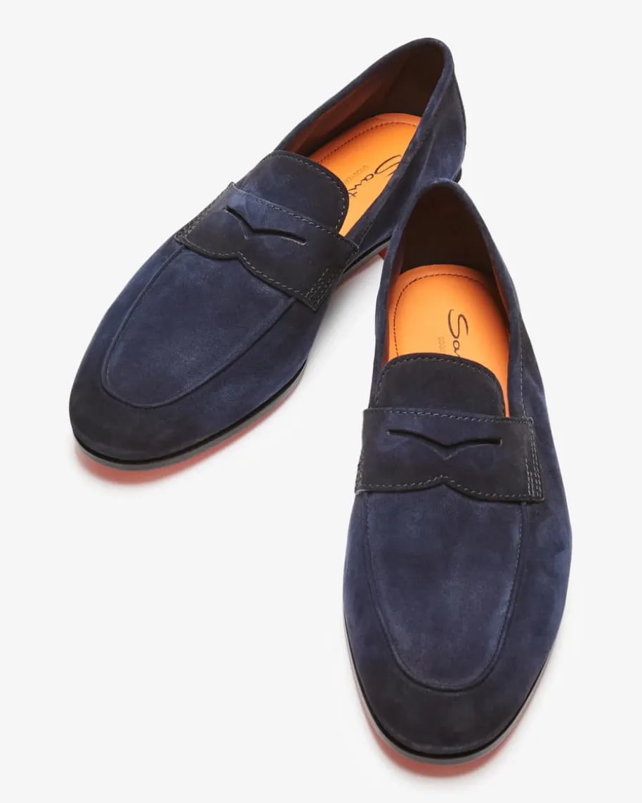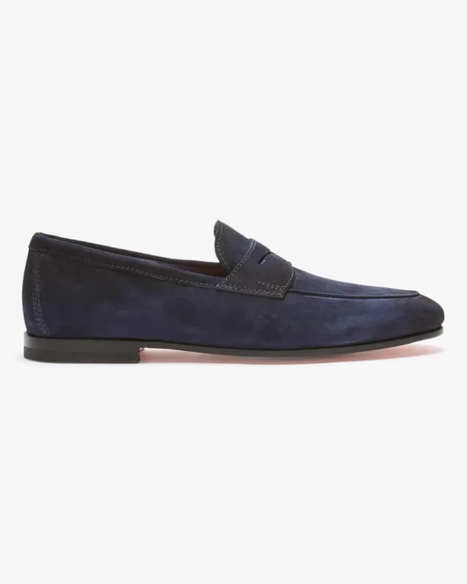 Carlos Penny Loafer für Herren von Santoni in Navy. Das Modell präsentiert sichdank der hochwertigen, soften Veloursleder-Verarbeitung und schlichterAufmachung in elegantem Look, während die feine Steppnaht sowie dercharakteristische Querriegel stilvolle Akzente setzen.