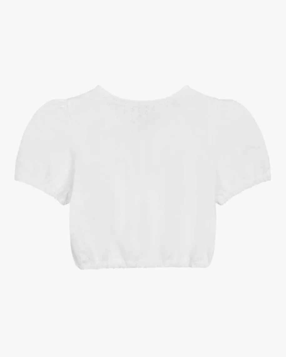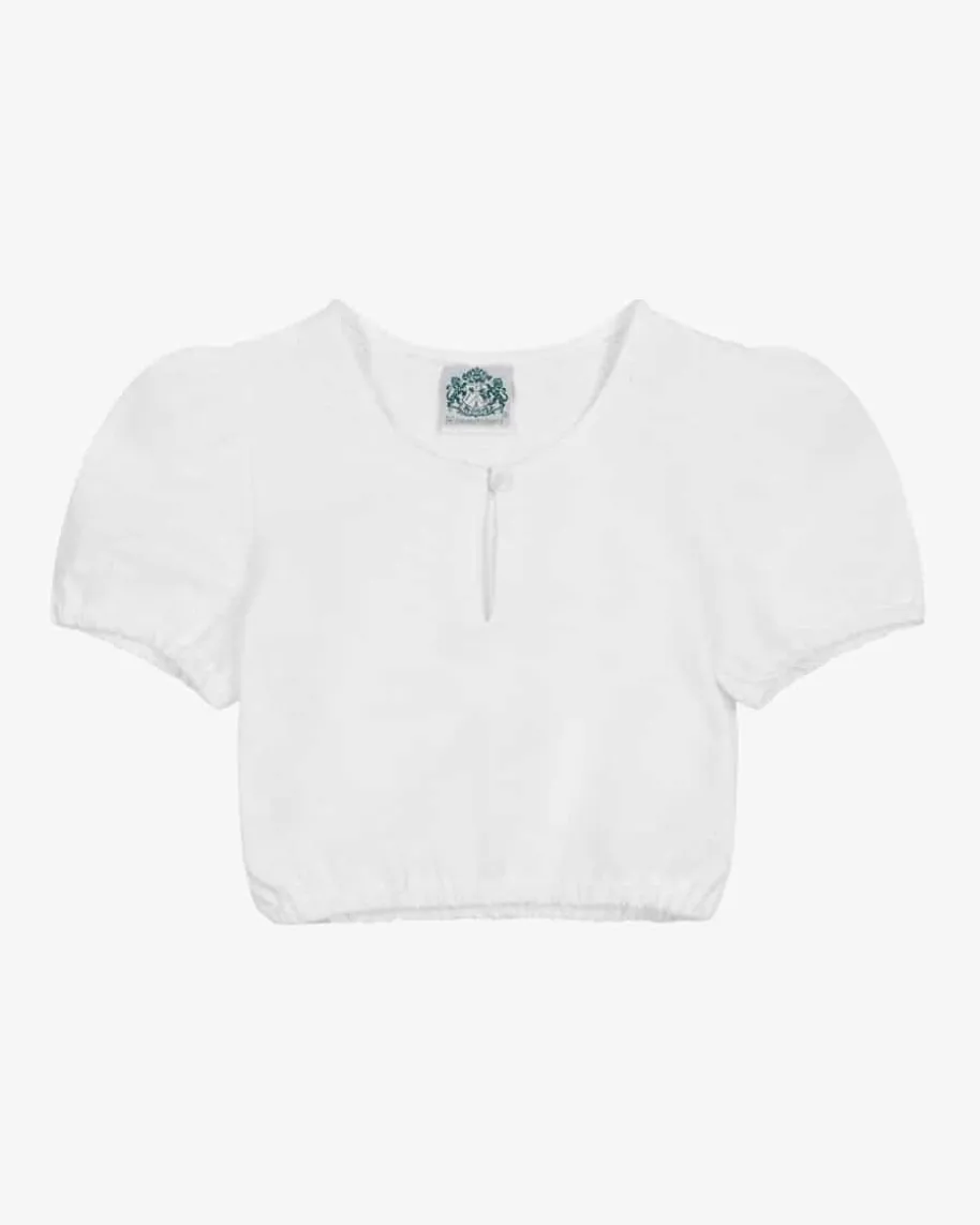 Caro Dirndlbluse für Mädchen von Hammerschmid in Weiß. Das Modell überzeugt intraditioneller Aufmachung, während die elastische Baumwoll-Qualität eineangenehme Haptik verspricht.