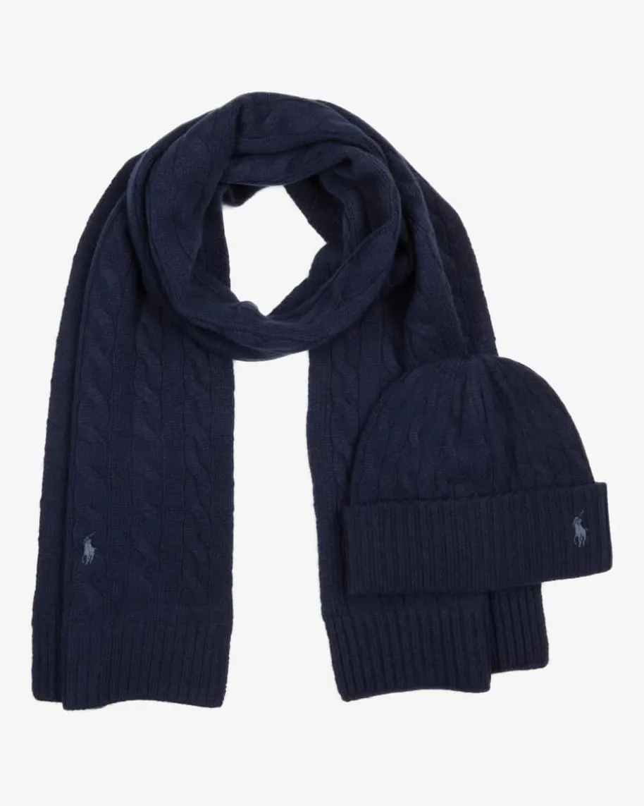 Mützen-Schal-Set für Herren von Polo Ralph Lauren in Navy. Dieses Set aushochwertiger Cashmere-Qualität überzeugt mit seiner weichen Haptik, während dasZopfstrickmuster in Kombination mit der melierten Aufmachung einen zeitlosenBegleiter für kalte Wintertage schafft. Dank der stilvollen Box eignet sich dasSet auch perfekt als Geschenk.