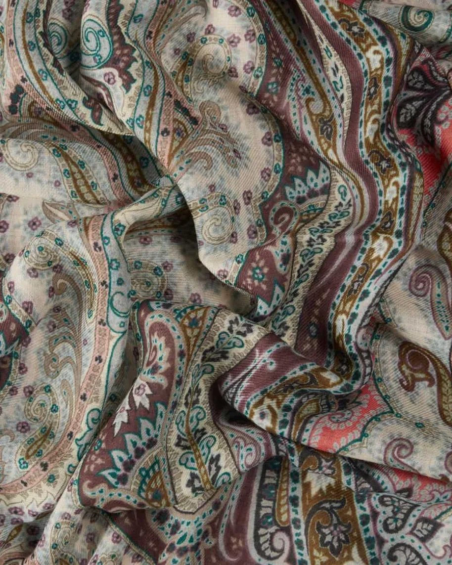 Cashmere-Schal für Damen von Etro in Beige, Aubergine und Bunt. Das Modellbesticht dank des labeltypischen Paisley-Dessins in stilvoller Aufmachung,während die semitransparente Cashmere-Qualität sowie feine Fransen-Details demGesamtbild einen Hauch von Luxus verleihen.