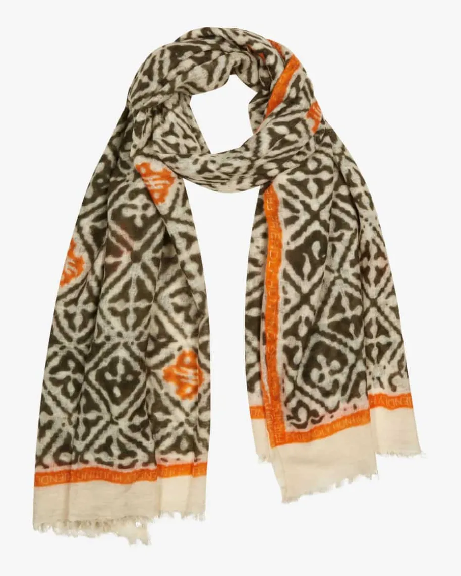 Cashmere-Schal für Damen von Friendly Hunting in Dunkeloliv, Creme und Orange.Lassen Sie sich durch die hochwertige Cashmere-Qualität haptisch verwöhnen,während das modische Allover-Dessin sowie Fransen-Details ein stilvollesAccessoire kreieren.