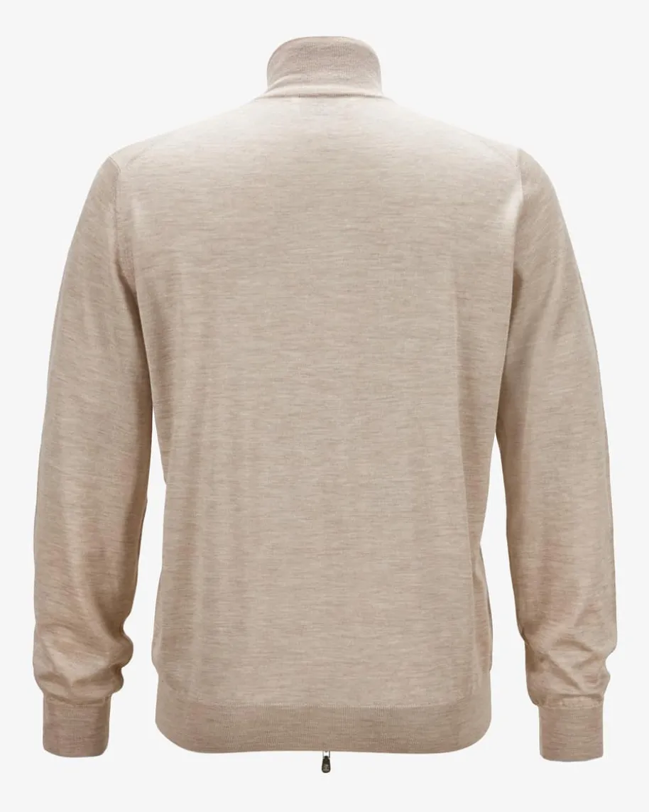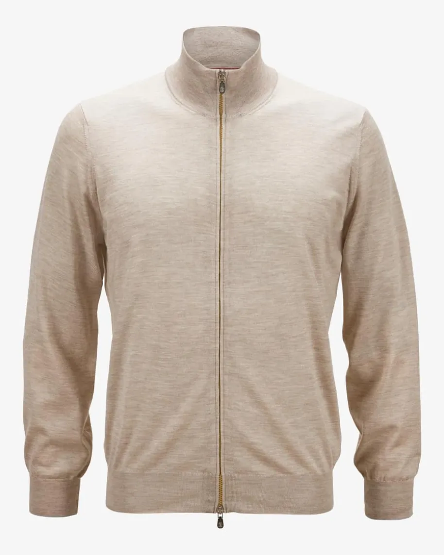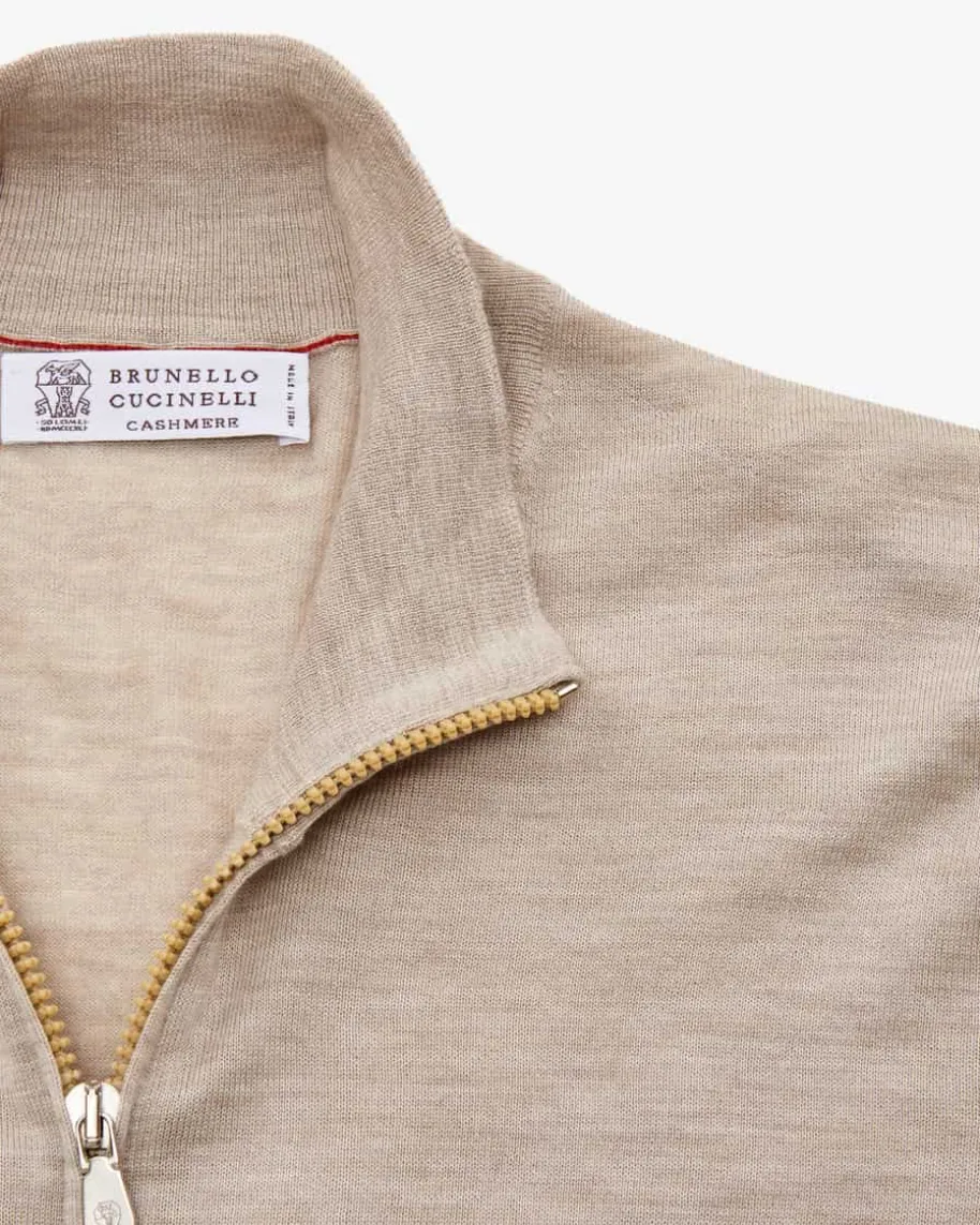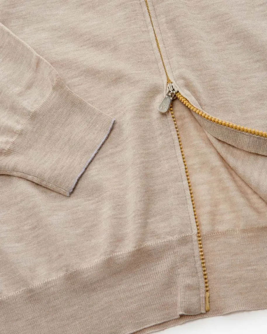 Cashmere-Seiden-Strickjacke für Herren von Brunello Cucinelli in Sand. LassenSie sich von demfeinen Cashmere-Seiden-Mix haptisch verwöhnen, während das minimalistischeDesign sowie feine Kontrast-Details an den Ärmelenden ein zeitloses Piece fürjede Herrengarderobe kreieren.