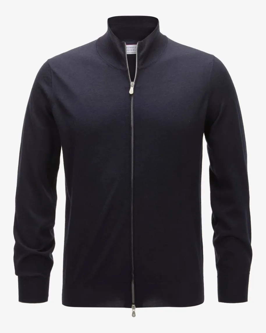 Cashmere-Seiden-Strickjacke für Herren von Brunello Cucinelli in Nachtblau.Lassen Sie sich vondem feinen Cashmere-Seiden-Mix haptisch verwöhnen, während das minimalistischeDesign sowie feine Kontrast-Details an den Ärmelenden ein zeitloses Piece fürjede Herrengarderobe kreieren.