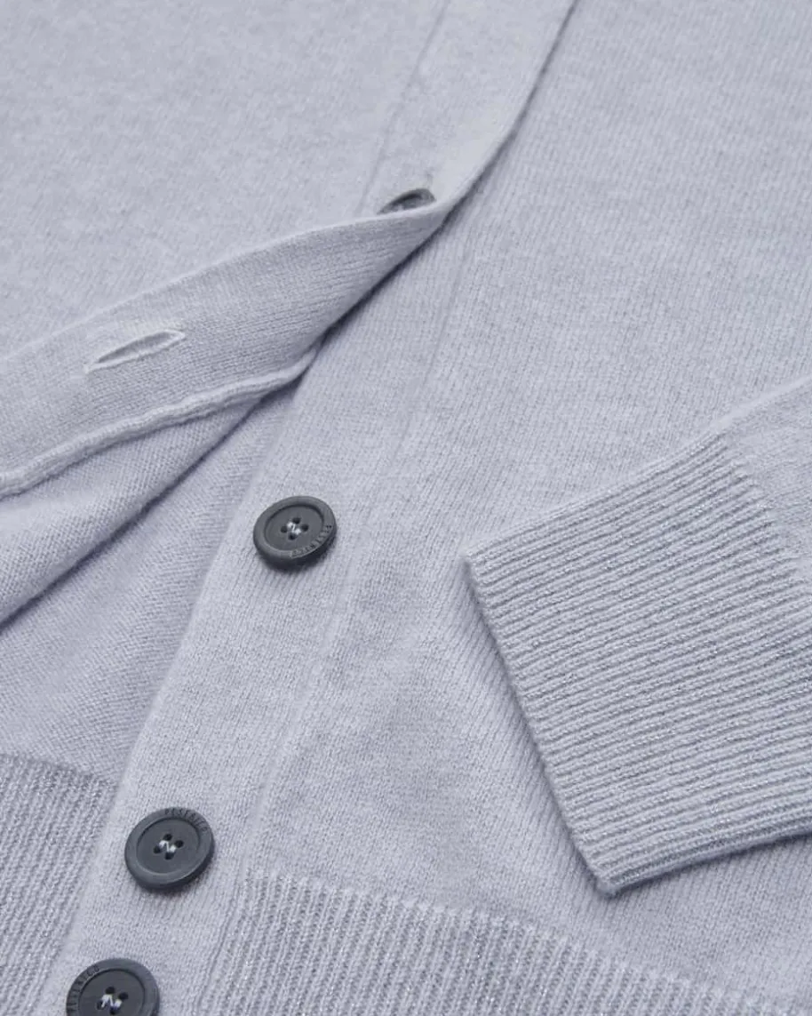Cashmere-Strickjacke für Damen von Peserico in Hellblau. Fashion fürstilbewusste Damen, die cleane Mode aus Italien lieben – Das Modell aus feinemCashmere-Mix präsentiert sich als vielseitiger Begleiter, während dieGlitzerfasern zusammen mit den labelypischen Schmuckketten-Applikationenmodische Akzente setzen.