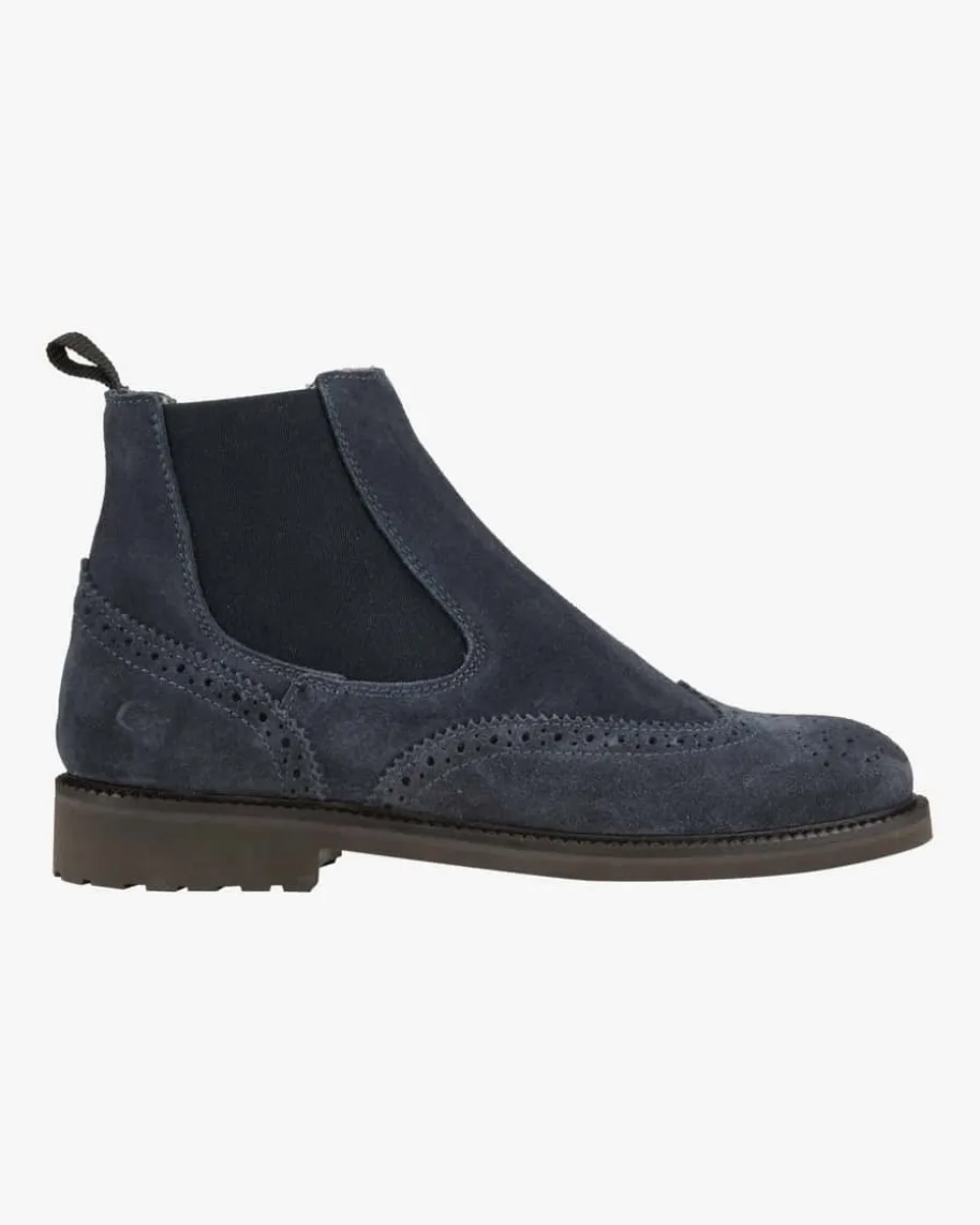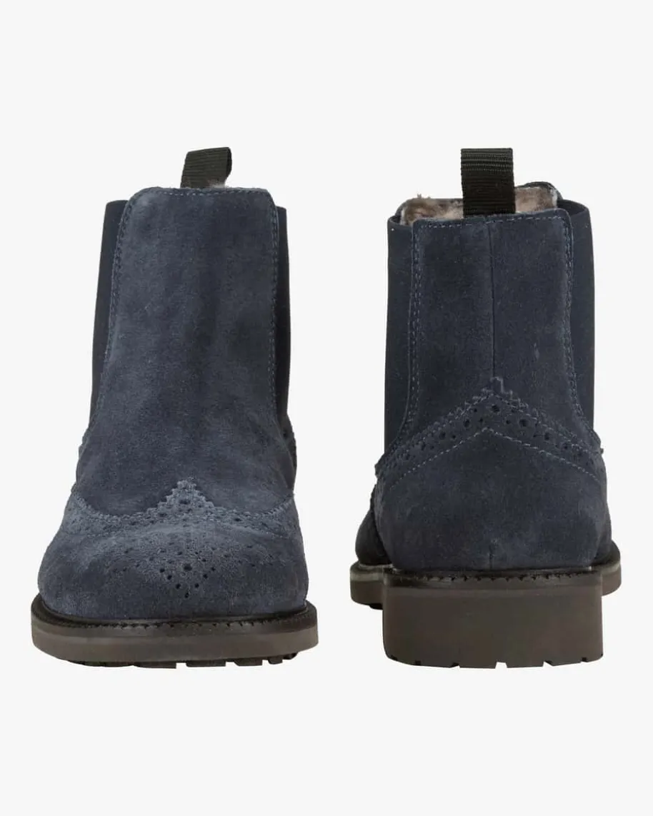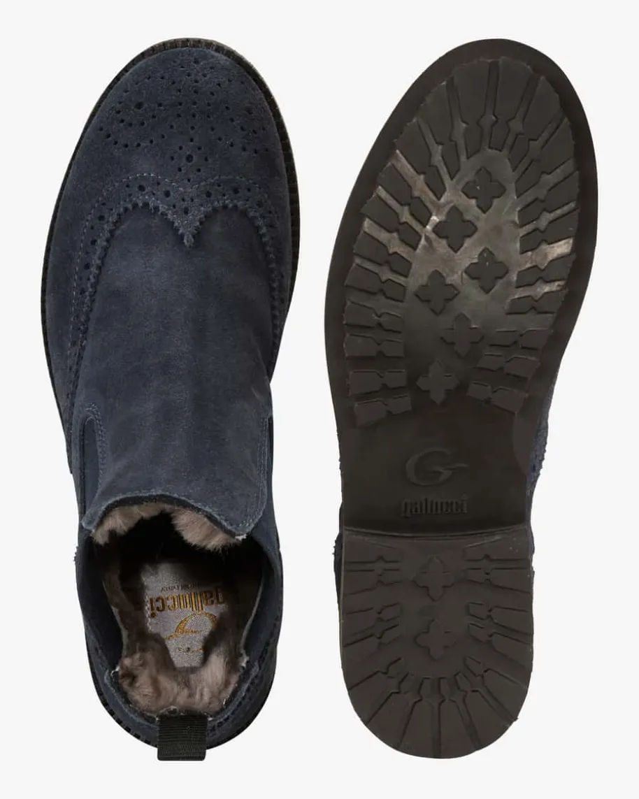 Chelsea Boots für Kinder von Galluci in Navy. Das gefütterte Modell aushochwertigem Veloursleder überzeugt mit hohem Tragekomfort sowie mit Schutz vorKälte, während das Budapester-Muster einen modischen Look kreiert.