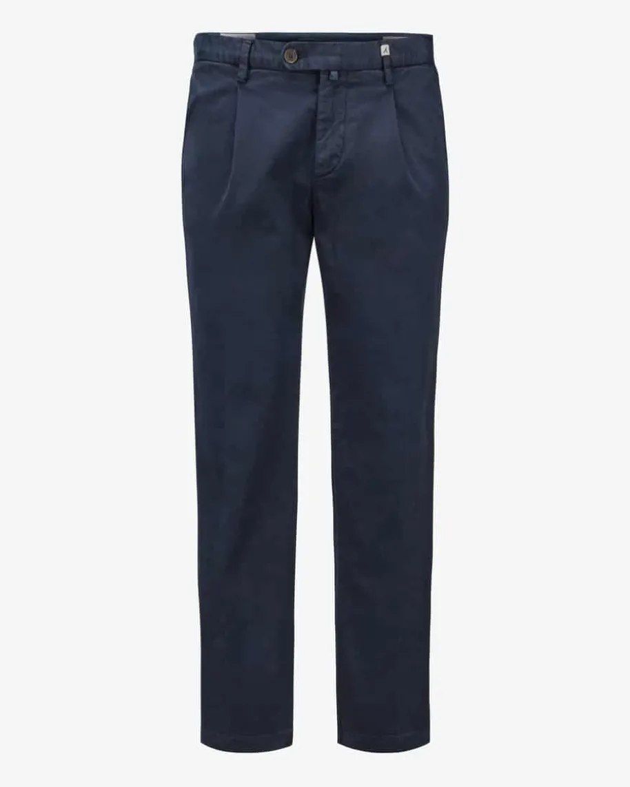 Chino für Herren von Myths in Navy. Ein Klassiker mit Stil – Das Modell inweicher Gabardine-Qualität punktet mit zeitlosem Design und hohem Tragekomfort,während die Bundfalten das Gesamtbild stilvoll unterstreichen.