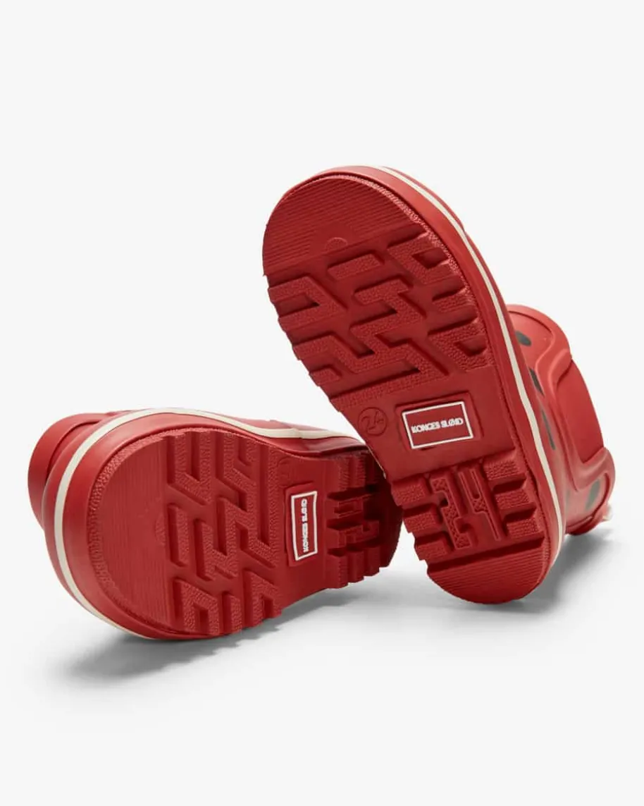 Cinelle Gummistiefel für Kinder von Konges Slojd in Rot und Schwarz. Das Modellbesticht dank des süßen Marienkäfer-Designs in niedlicher Aufmachung, währendelastische Einsätze den perfekten Sitz garantieren.