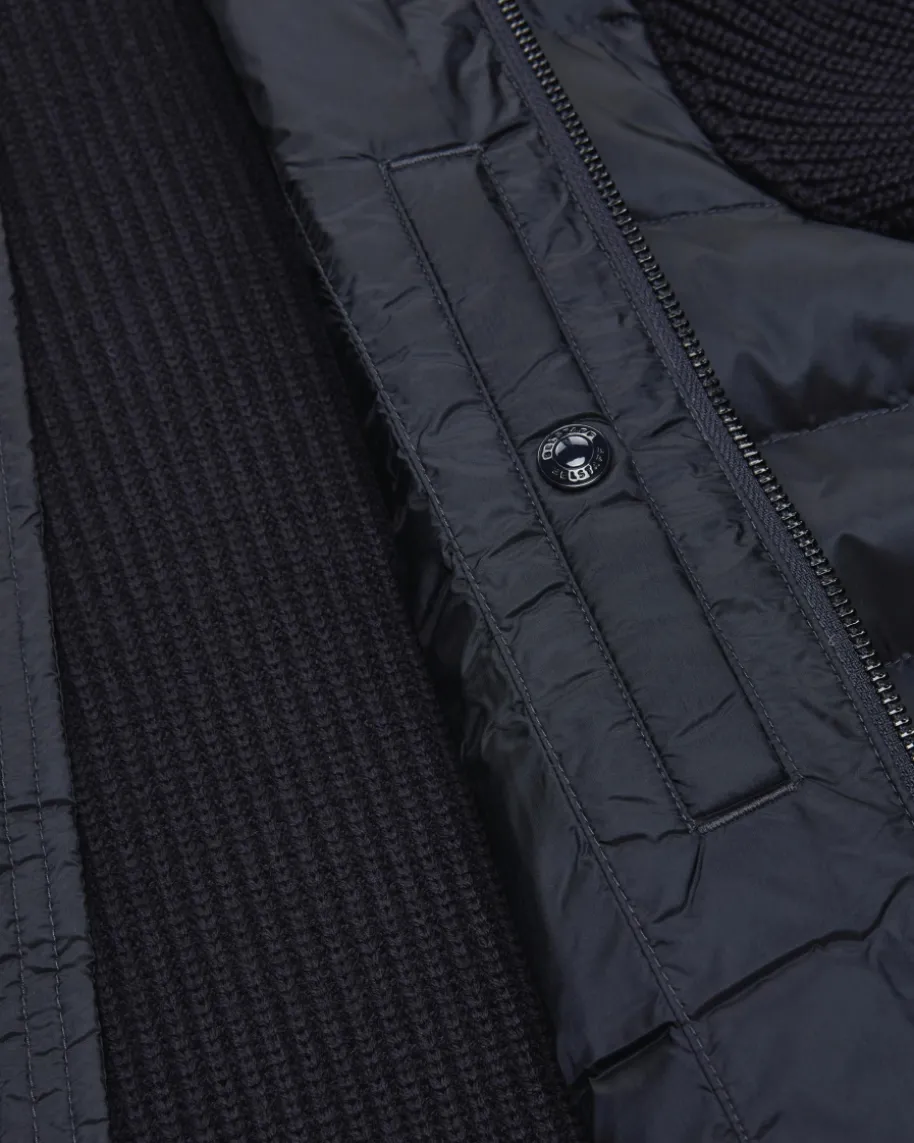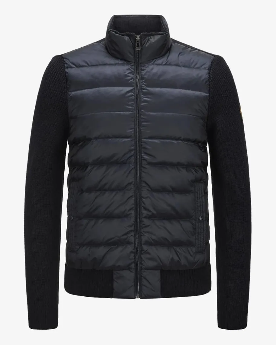 Circuiteer Hybrid-Strickjacke für Herren von Belstaff in Navy. Das Modellbegeistertdank der raffinierten Kombination aus leichten Wollstrick-Elementen undgesteppter Vorderseite mit hochwertiger Daunen-Füllung als sportiver Casual-Begleiter für die Übergangszeit.