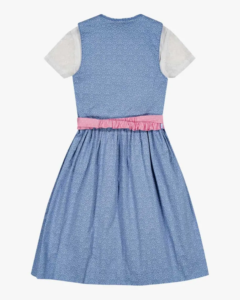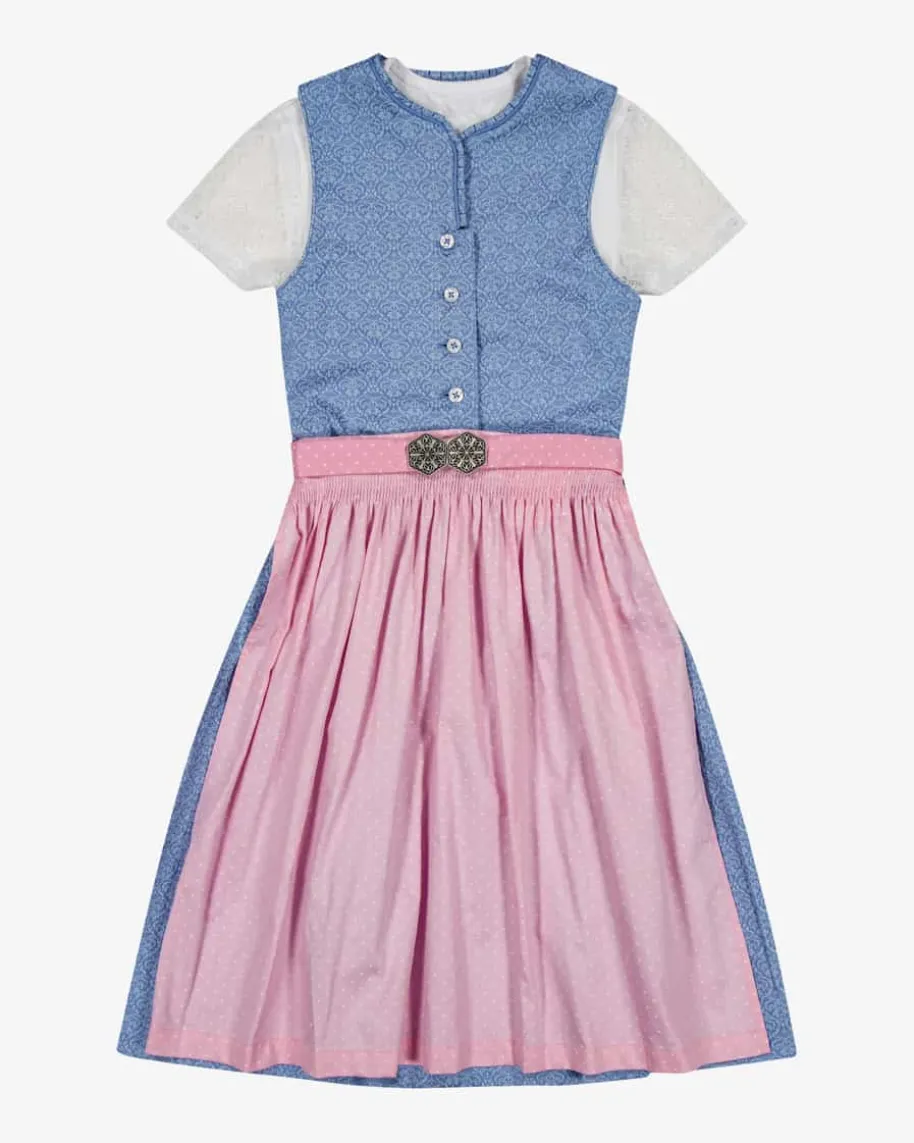Claudia Dirndl mit Bluse und Schürze für Mädchen von LODENFREY in Hellblau undRosa. Das hochgeschlossene Modell überzeugt durch das feine Allover-Dessin sowiedie gepunktete Schürze in traditioneller Aufmachung, während die Spitzenbluseund die raffinierte Steckschließe den Look niedlich abrunden.