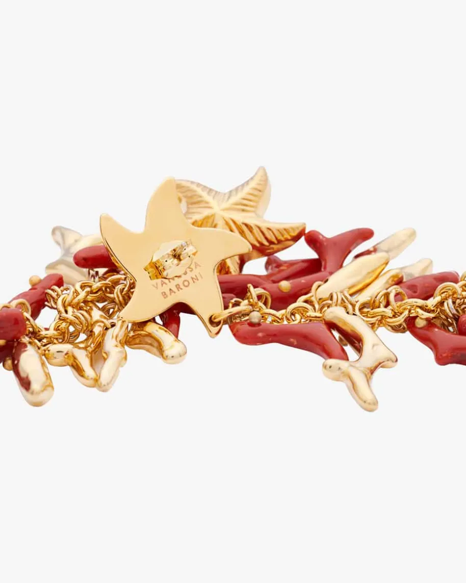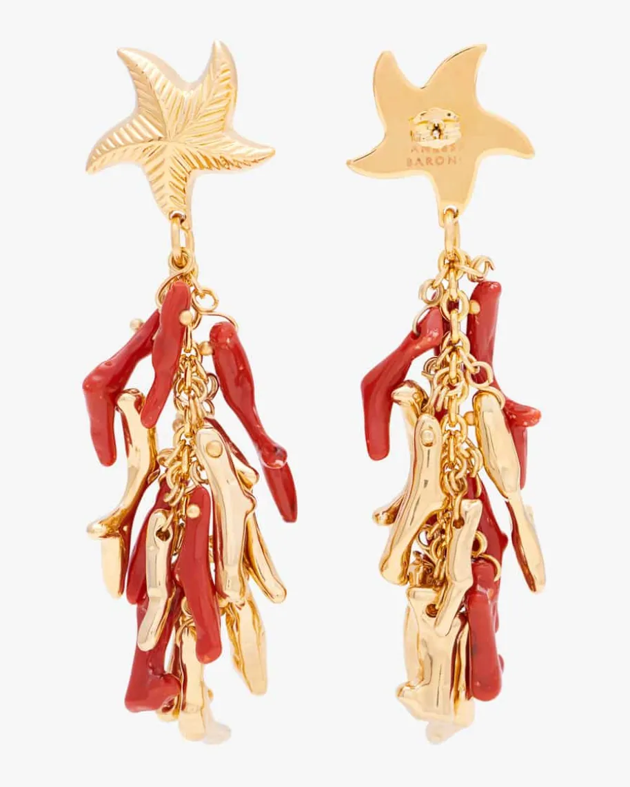 Coral Ohrringe von Vanessa Baroni in Koralle und Gold. Das im Jahr 2009gegründete Label Vanessa Baroni wurde von der gleichnamigen Designerin gegründetmit dem Ziel, markante Accessoires für angesagte Looks schaffen. Dabei stammtdie Inspiration von Reisen, Kunst sowie der aktuellen Mode. Auch dieses Ohrringeüberzeugen in einzigartigem Korallen-Dessin, während die goldfarbenen Seesterneden maritimen Look perfekt ergänzen.